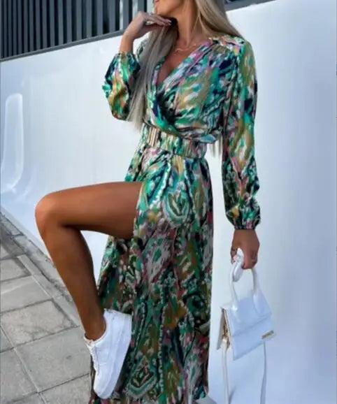 Getadme-보헤미안 플로럴 프린트 롱 드레스 여성 섹시 딥 V넥 롱 슬리브 하이 스플릿 스윙 드레스 벨트 포함 우아한 비치 드레스 베스티도