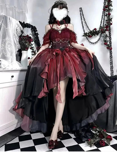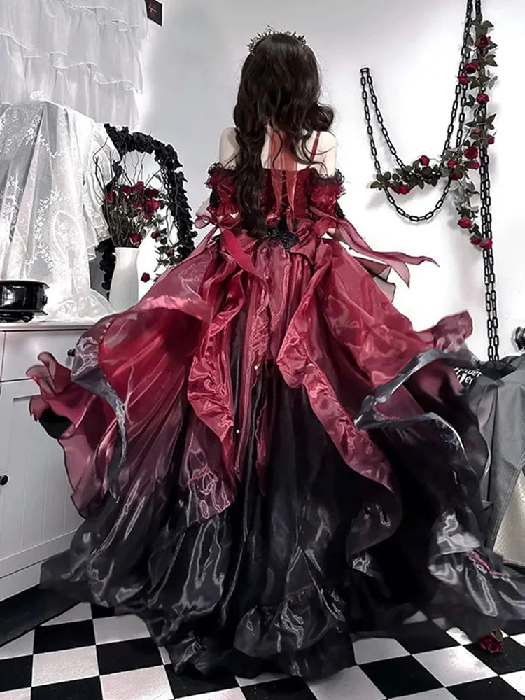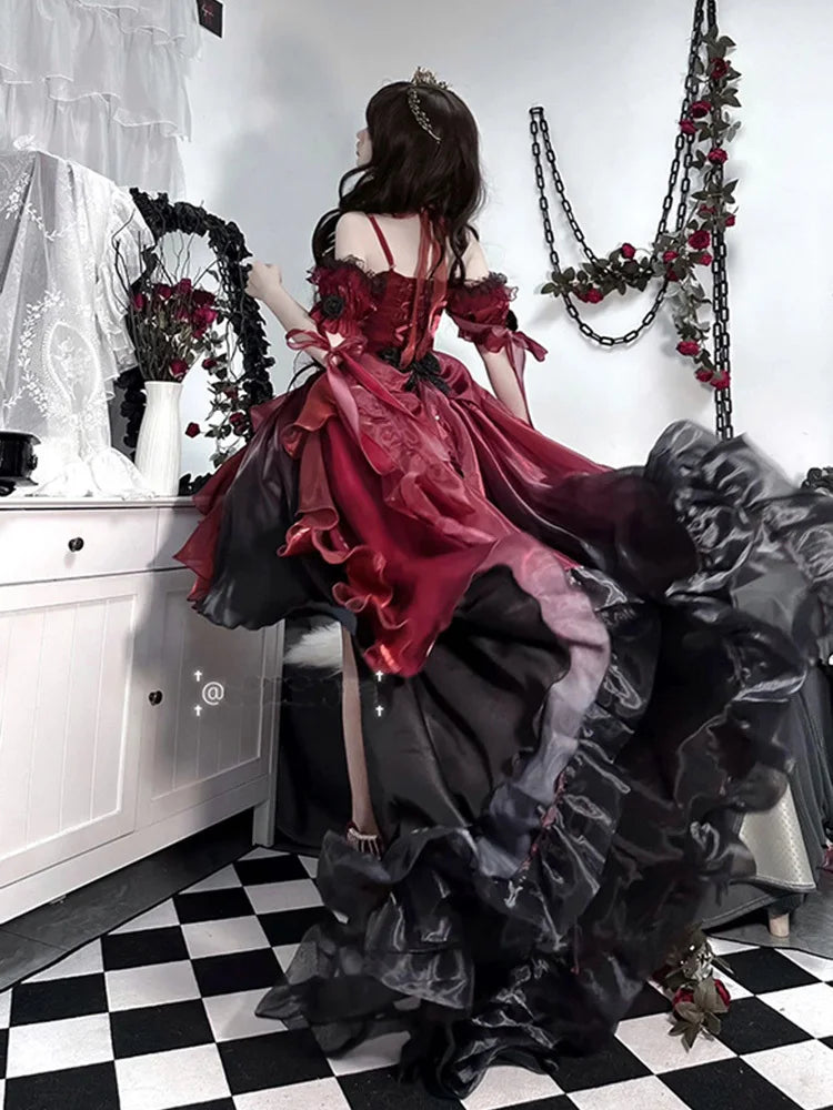 GETADME 다크 브라이드 레드 플라워 웨딩드레스 코스 로리타 드레스 Op 드레스 로리타 헤비 인더스트리 트레일 퍼피 프린세스 드레스, 로리타 코스프레