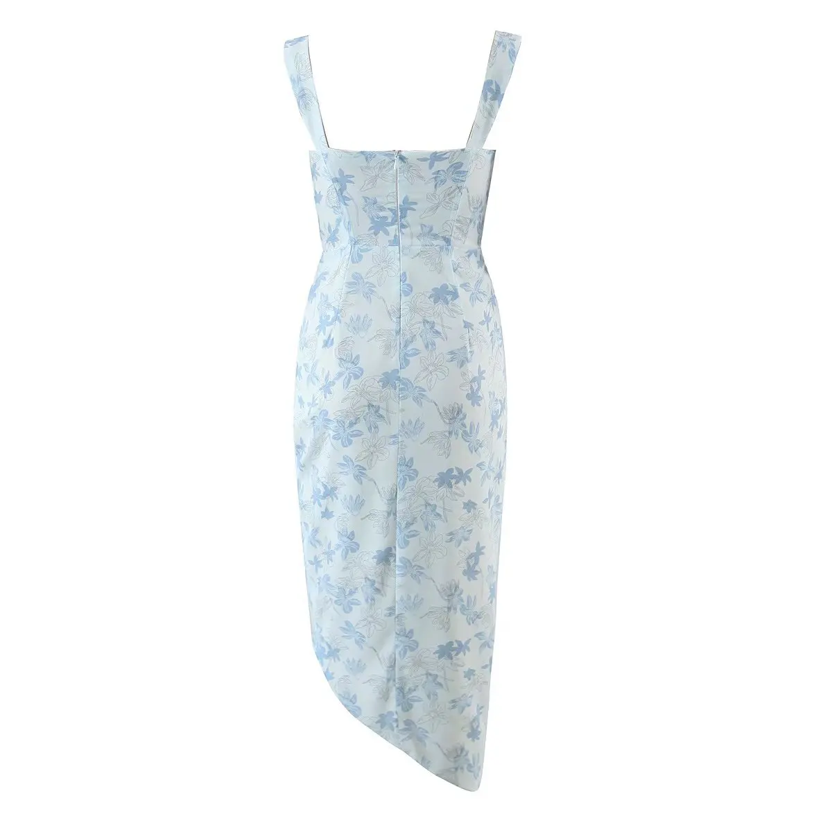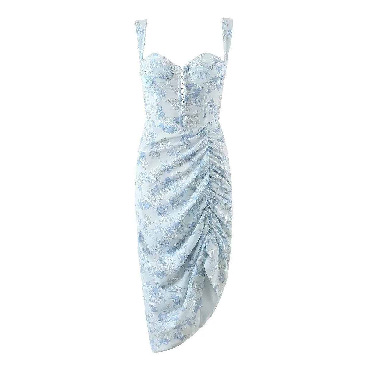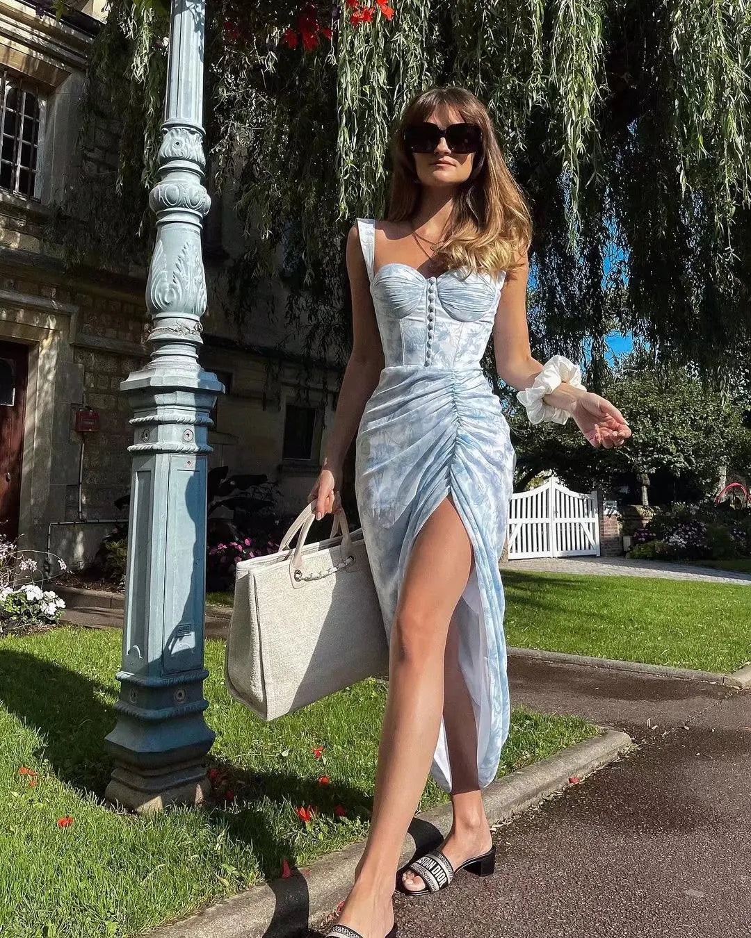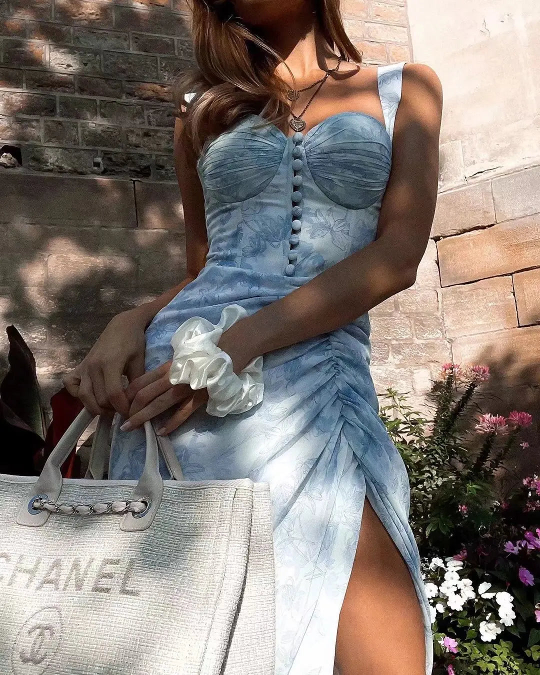 GETADME 디자이너 플로럴 프린트 여성 이브닝 드레스 섹시 사이드 스플릿 슬리브리스 스트랩 쉬폰 프롬 드레스 여름 스커트 로브 드 마리에