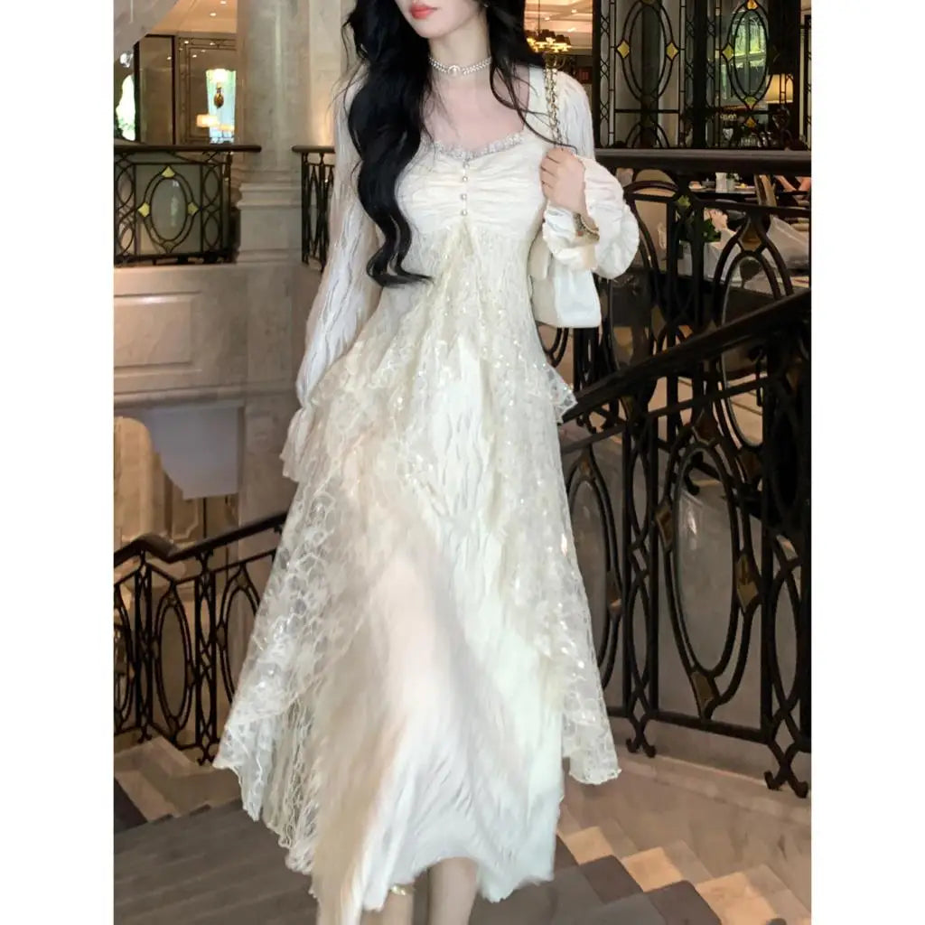 GETADME 우아한 솔리드 러플 페어리 드레스 한국 레이스 패치워크 슬림 허리 A라인 드레스 여성 프린세스 파티 베스디소 여성 가운 신상품
