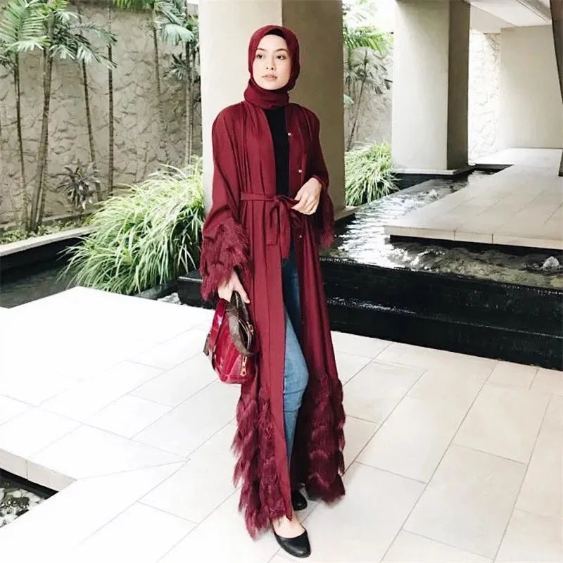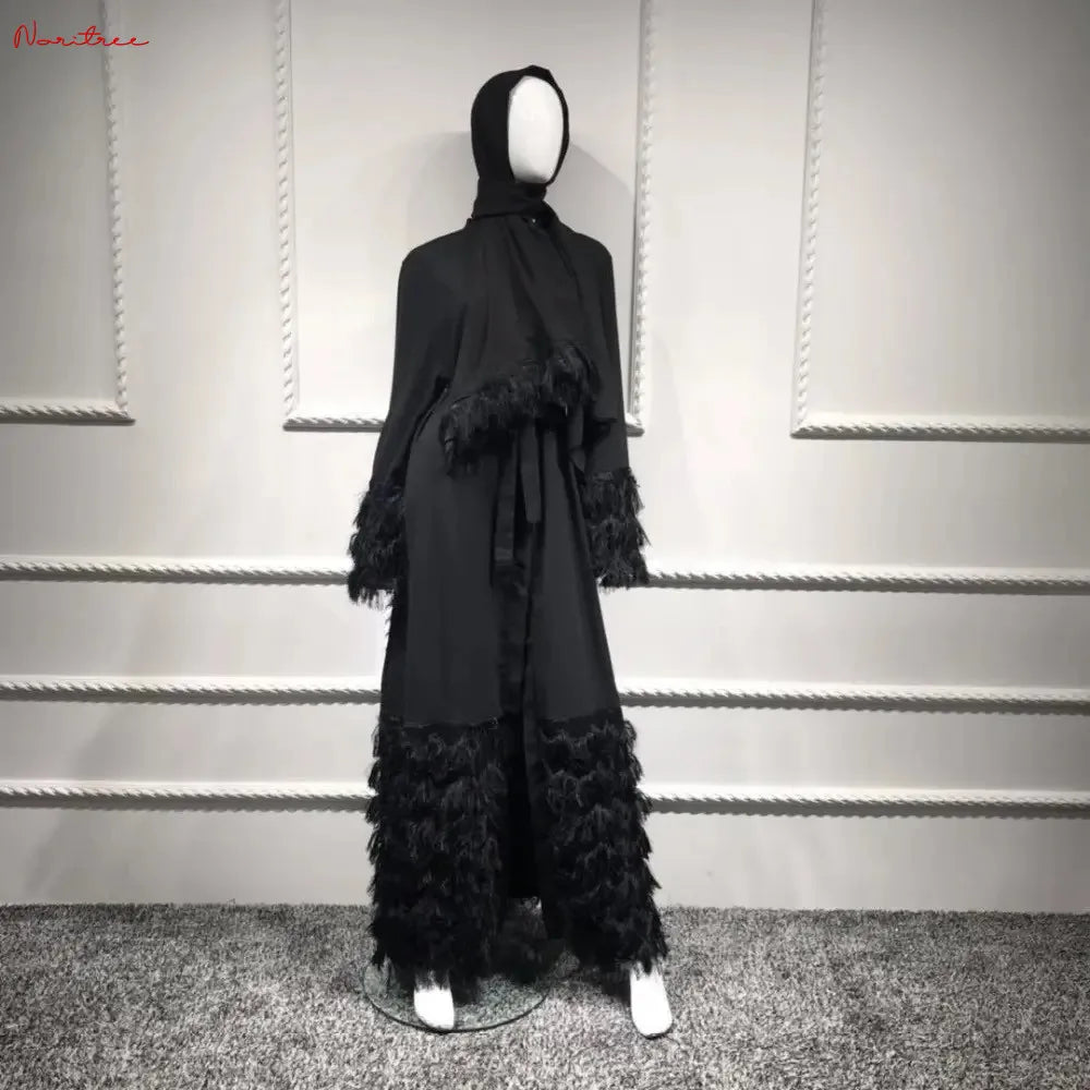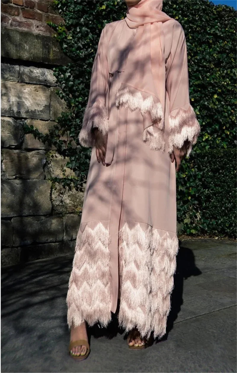 Getadme-우아한 두꺼운 푹신한 레이스 술 아바야 무슬림 드레스 전체 길이 두바이 여성 플레어 슬리브 이슬람 드레스 wy1333 드롭시핑