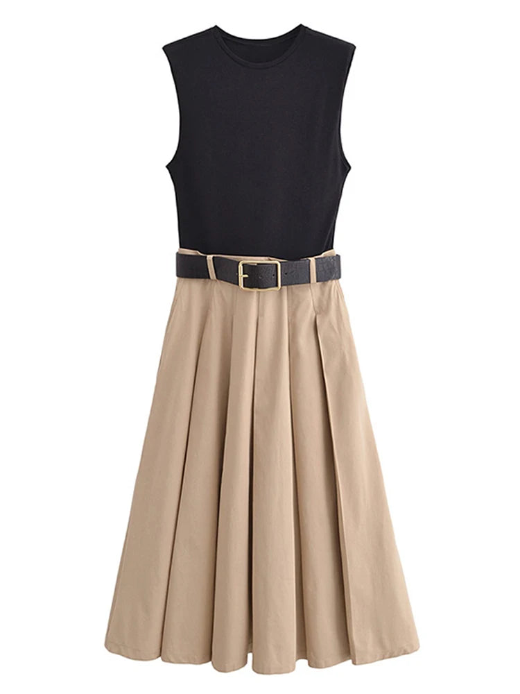 GETADME 패션 패치워크 플리츠 롱 드레스 (벨트 포함) 여성 시크 민소매 탱크 맥시 미디 드레스 레이디 하이웨이스트 홀리데이 파티 베스디소