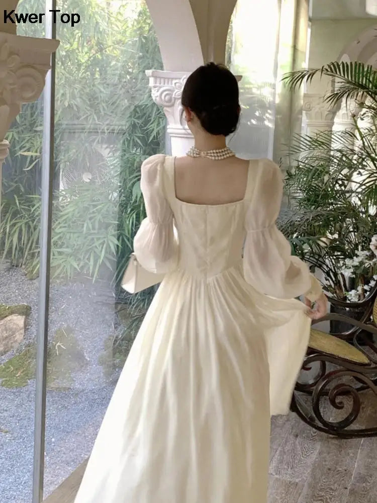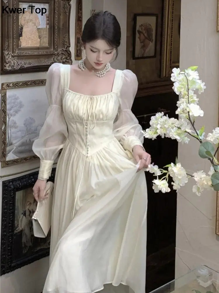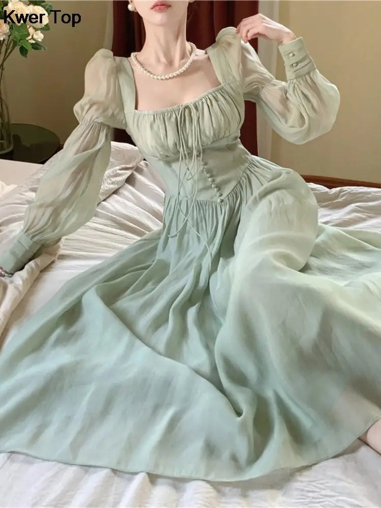 Getadme 프렌치 엘레강트 랜턴 슬리브 레이스업 미디 드레스 여름 여성 스퀘어넥 이브닝 파티 무도회 가운 여성 베스티도 무헤르 가을