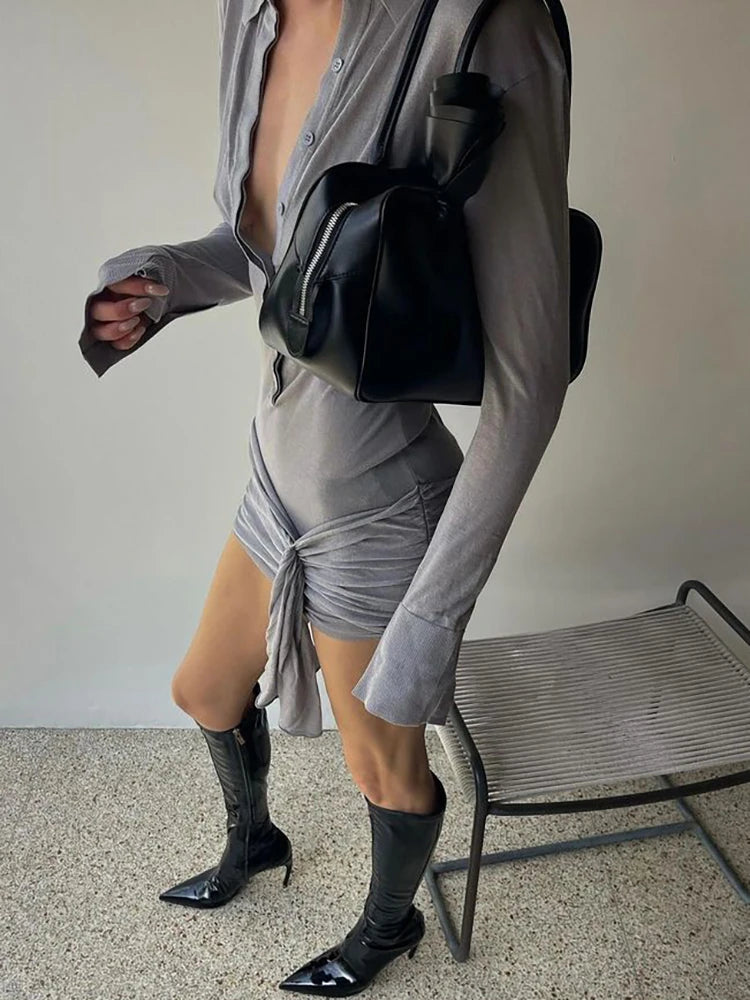 GETADME JULISSA MO 턴다운 칼라 붕대 주름 여성 드레스 긴팔 싱글 브레스티드 드레스 가을 신상 우아한 휴가 파티 드레스