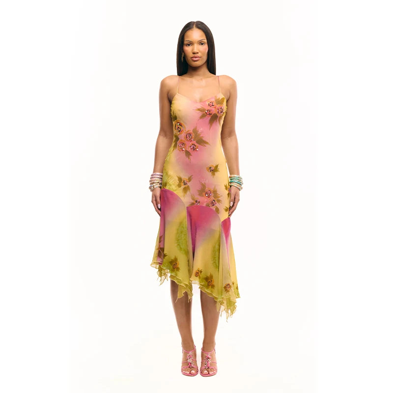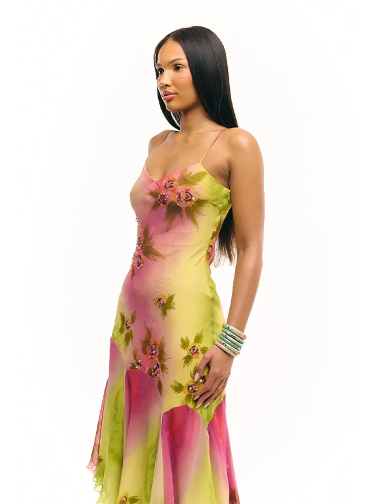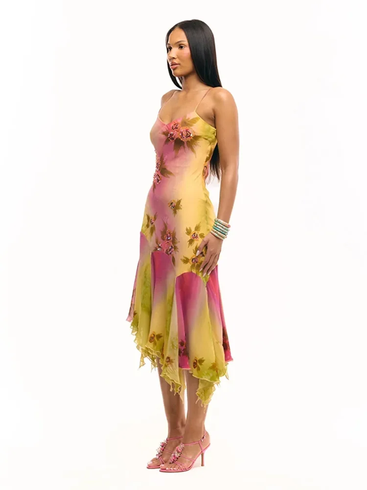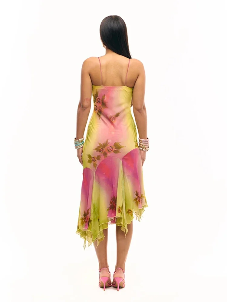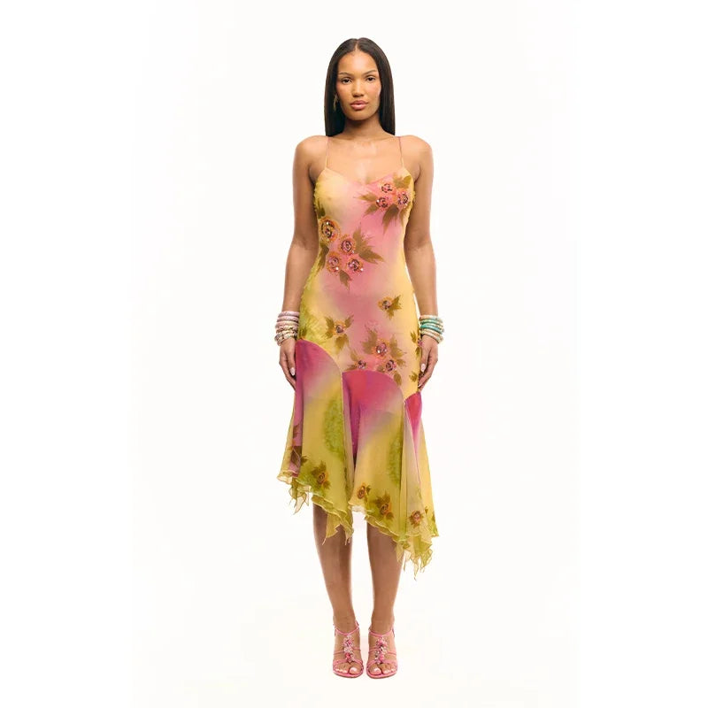 GETADME 새로운 컬러풀 플라워 슬리브리스 불규칙 롱 슬리밍 드레스 V넥 하이웨이스트 더블 레이어 드레스 여성 비치 의류