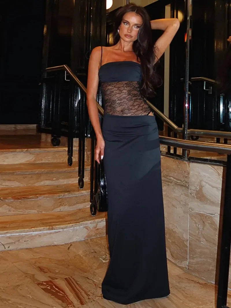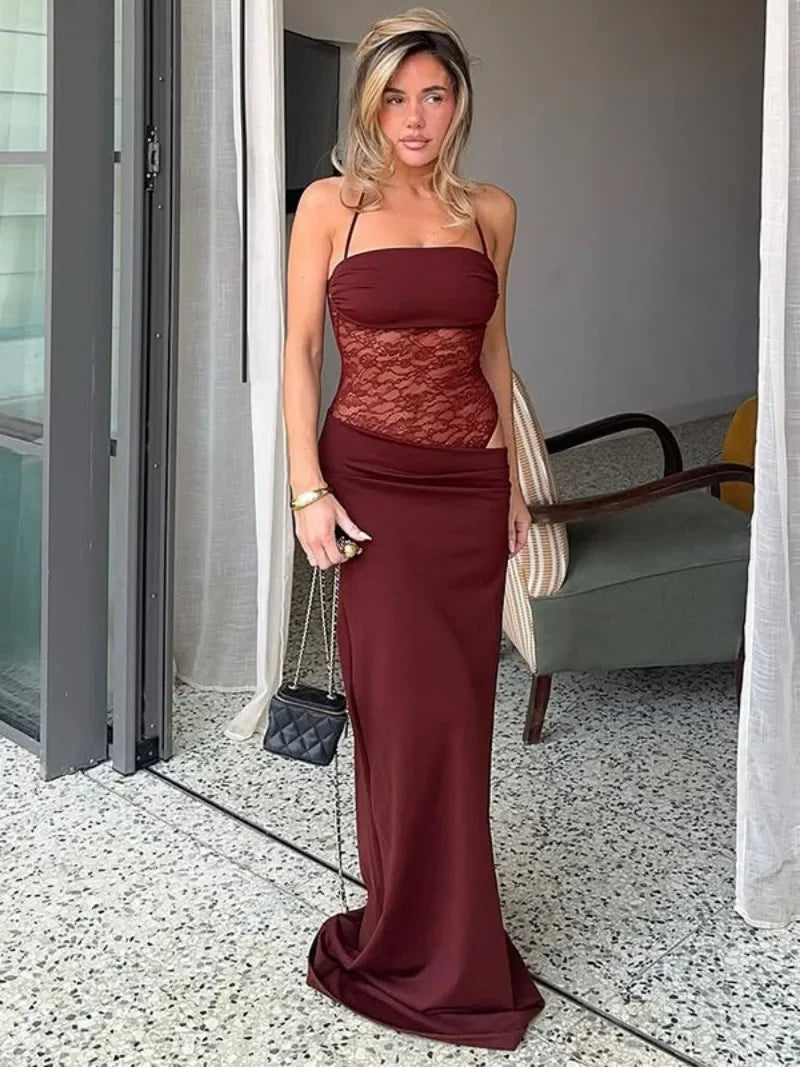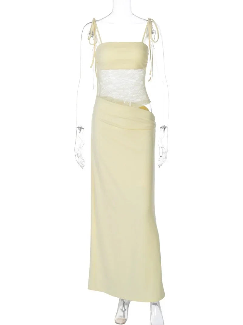 GETADME 여성용 섹시 붕대 메시 패치워크 롱 드레스 레이스업 시스루 비대칭 이브닝 파티 드레스 레이디 가운 하이 스트리트