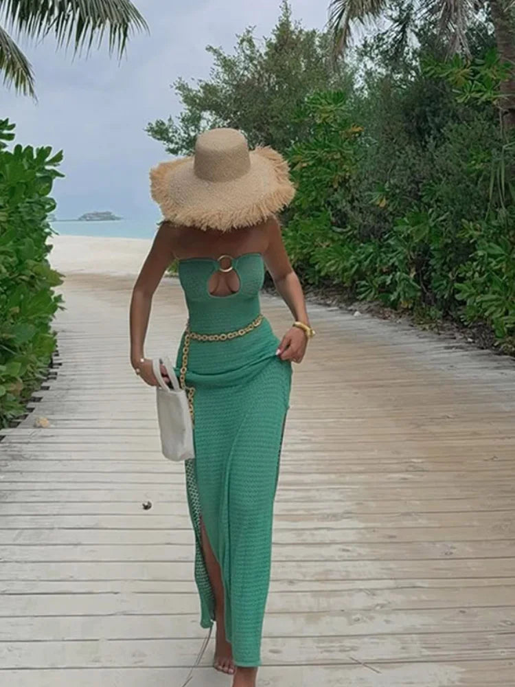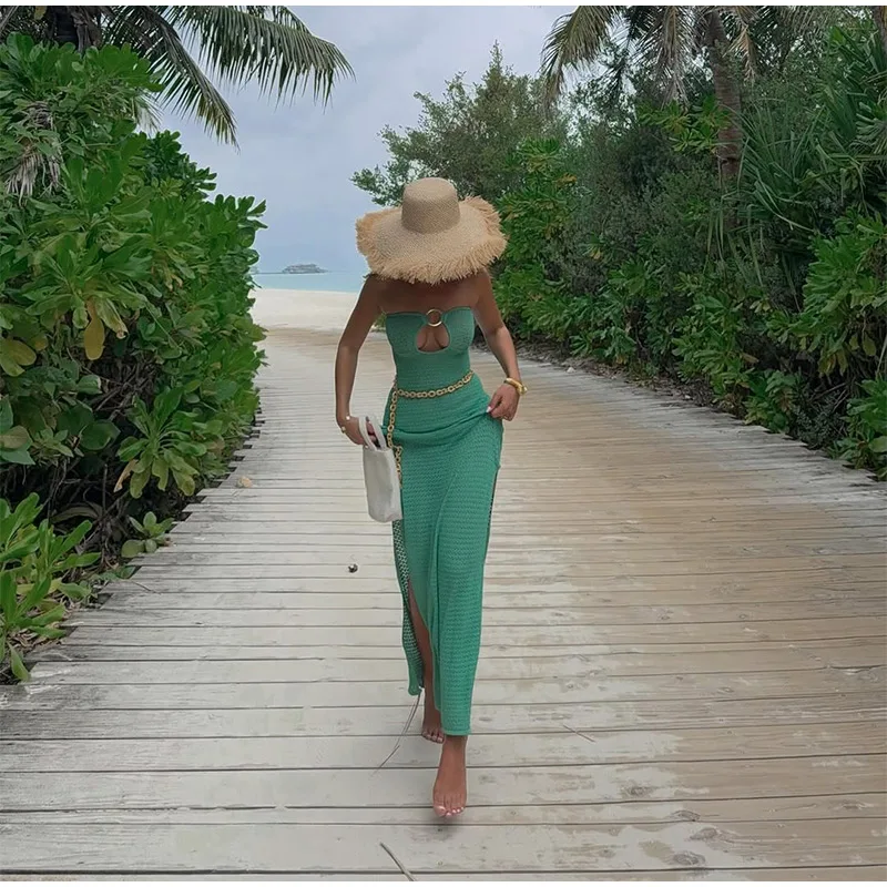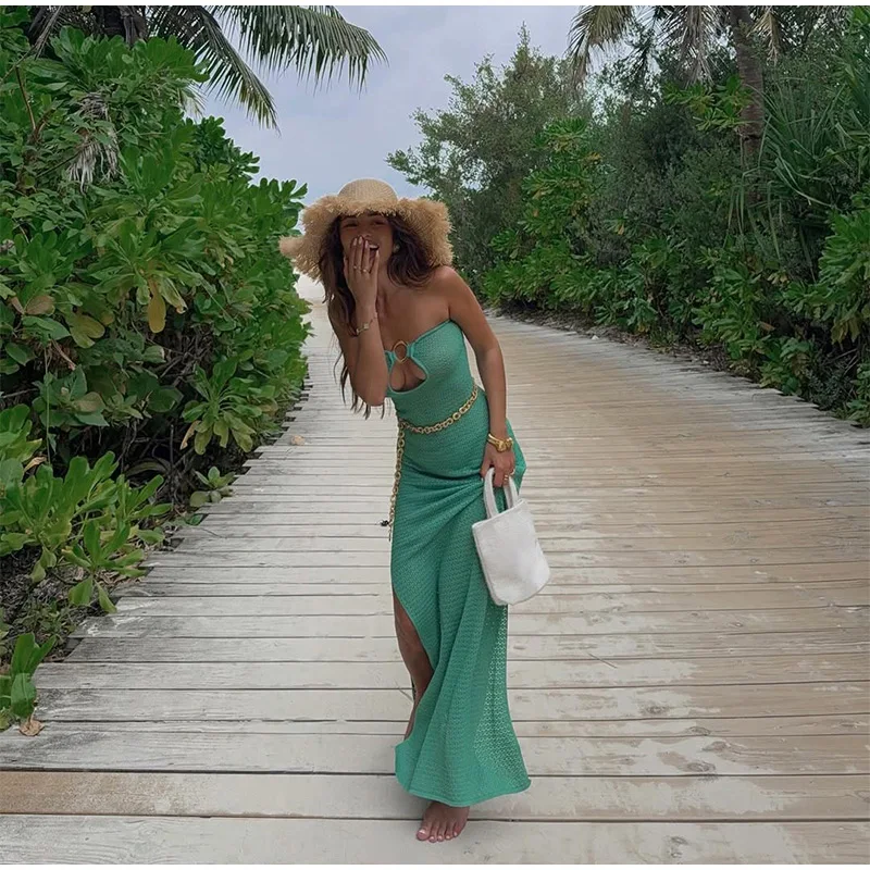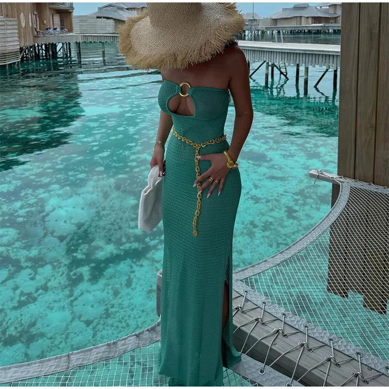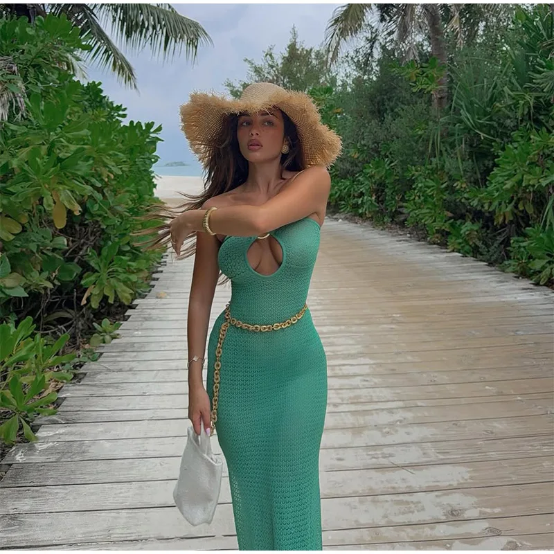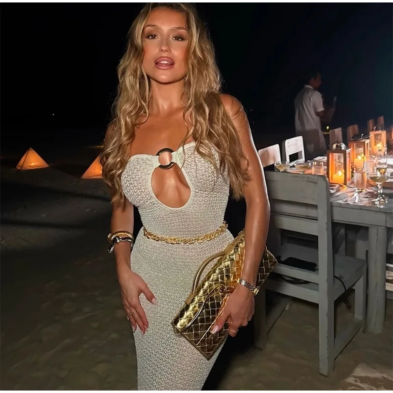 GETADME 여성용 섹시 할로우 아웃 링 링크 롱 드레스 우아한 스트랩리스 슬리브리스 백리스 맥시 드레스 여름 신직업 비치 로브