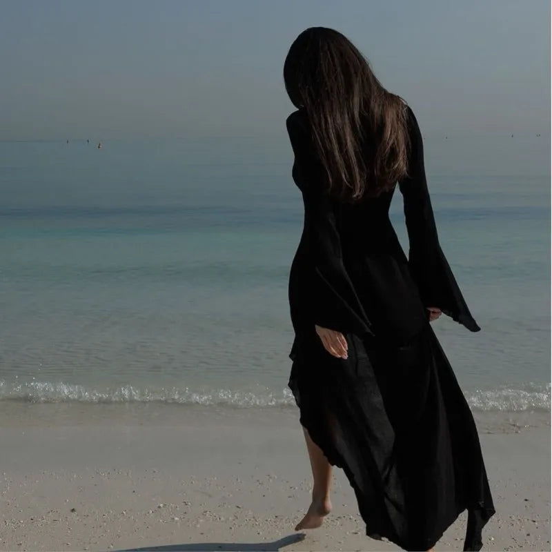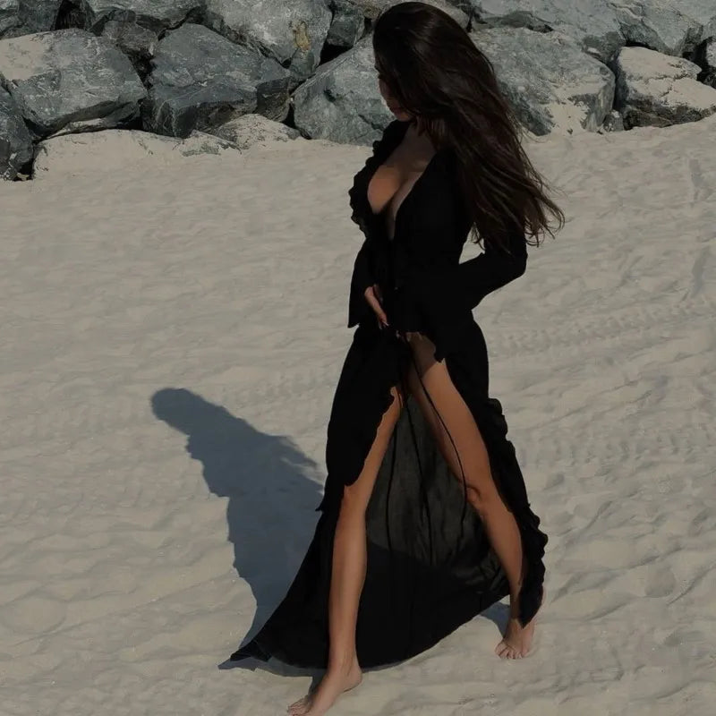 GETADME 섹시 핫걸 러플 화이트 카디건 비치 비키니 얇은 선크림 옷 플레어 슬리브 투명 여름 커버업 여성 롱 드레스