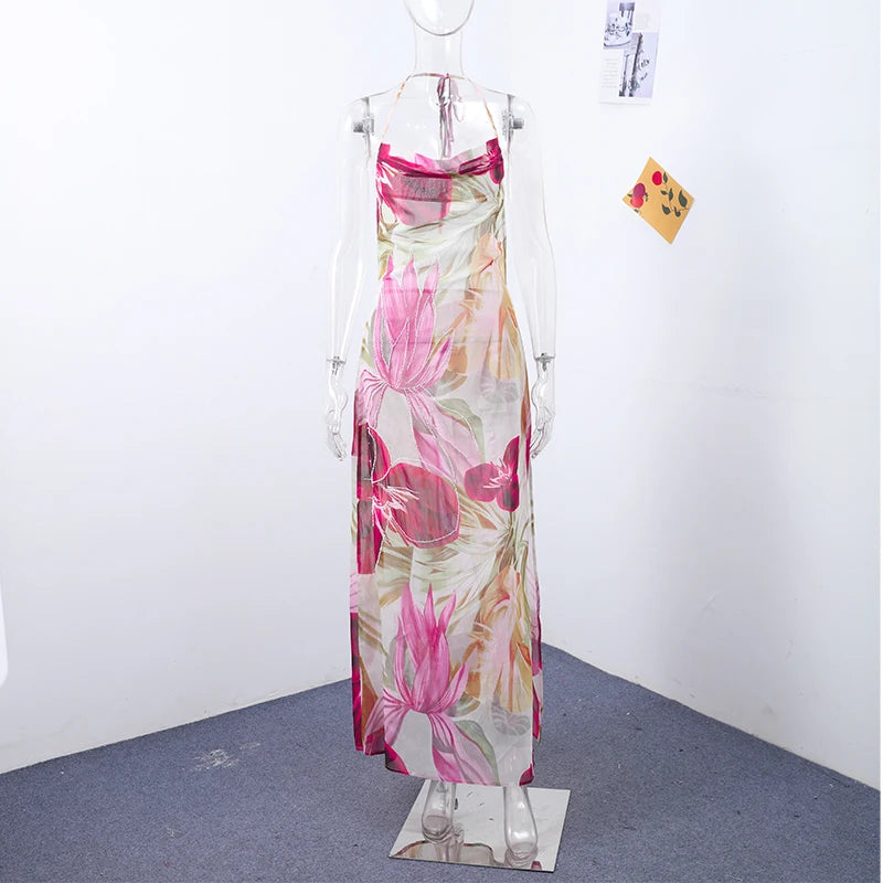 Getadme 섹시 프린트 V넥 홀터 롱 드레스 여성 레트로 슬리브리스 백리스 사이드 슬릿 비치 드레스 여성 패션 하이 스트리트 홀리데이