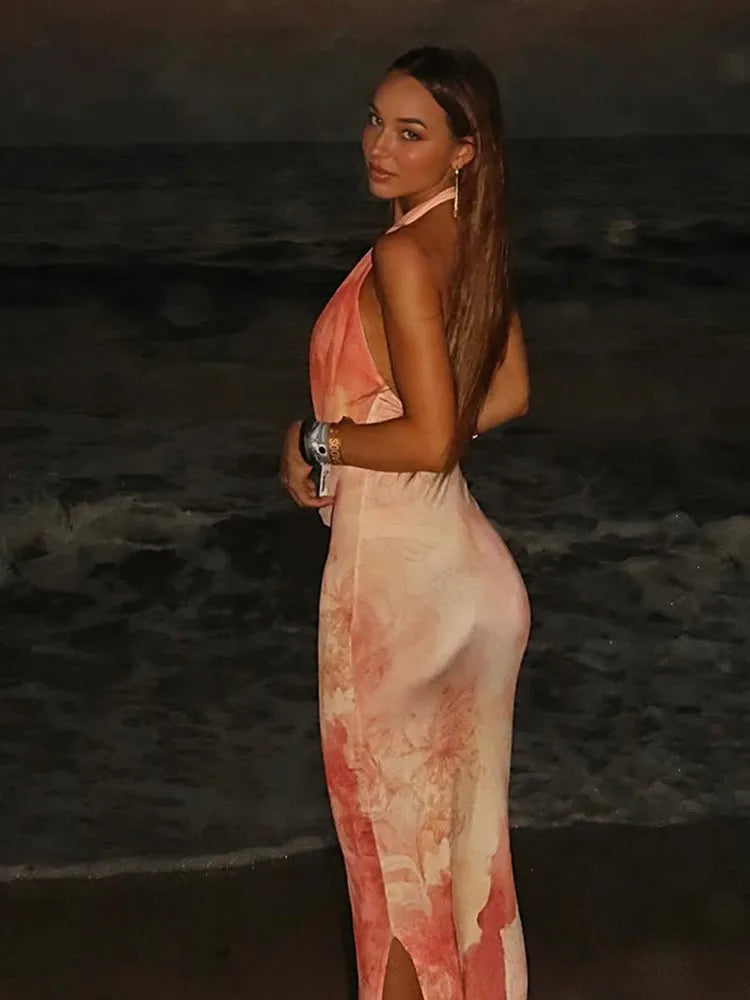 모델 번호 : 섹시한 V넥 프린트 플라워 홀터 롱 드레스