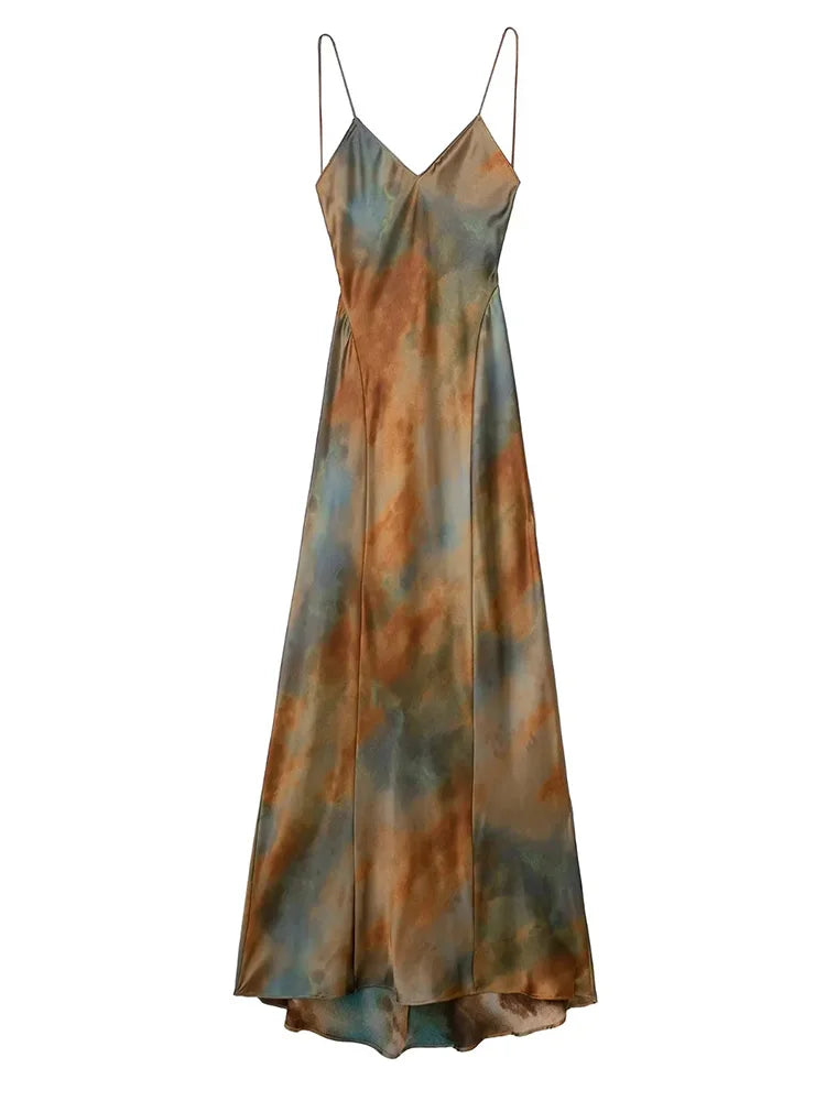 Getadme-여름 신상품 여성용 오픈 백 슬리브리스 드레스 패션 새틴 미디 길이 드레스 프린트 섹시 V넥 슬링 드레스