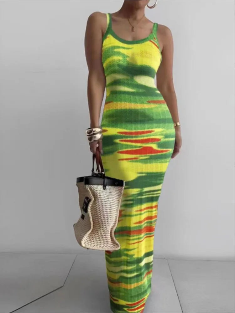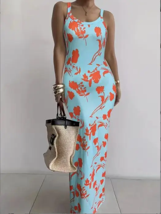 GETADME 여름 슬림 O넥 서스펜더 롱 드레스 여성 패션 섹시 플로럴 프린트 파티 바디콘 드레스 여성 Y2K