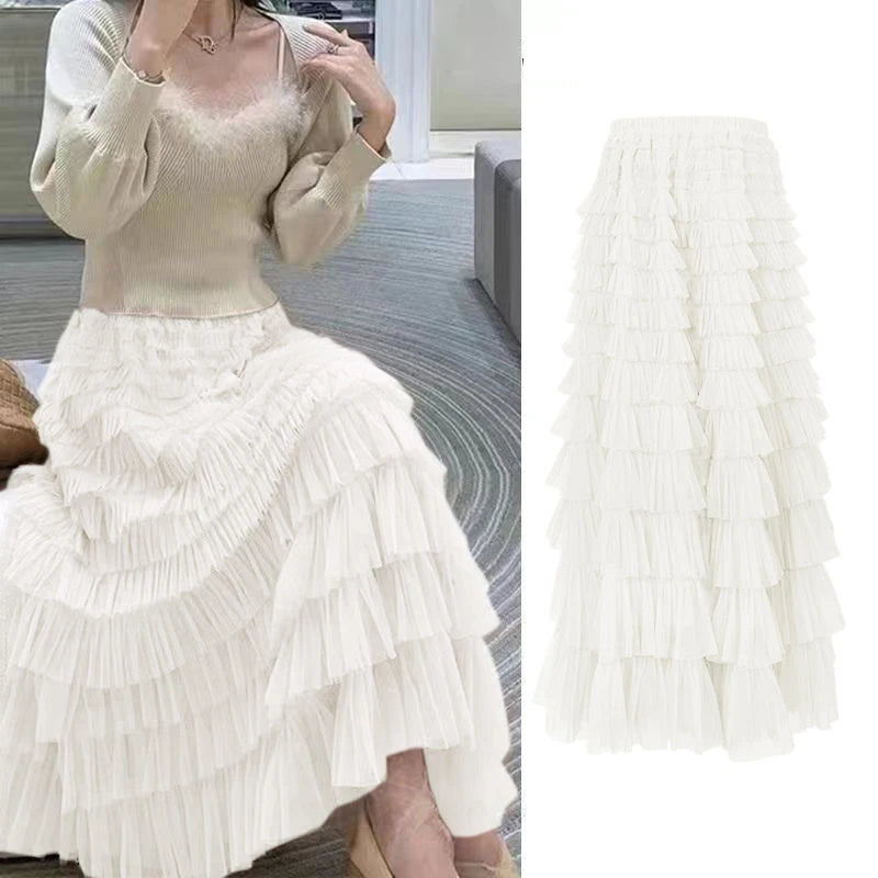 GETADME 여름 봄 여성용 멀티 레이어 러플 튤 스커트 플리츠 하이웨이스트 플러피 맥시 스커트 페어리 케이크 드레스 롱 투투 파티 스커트