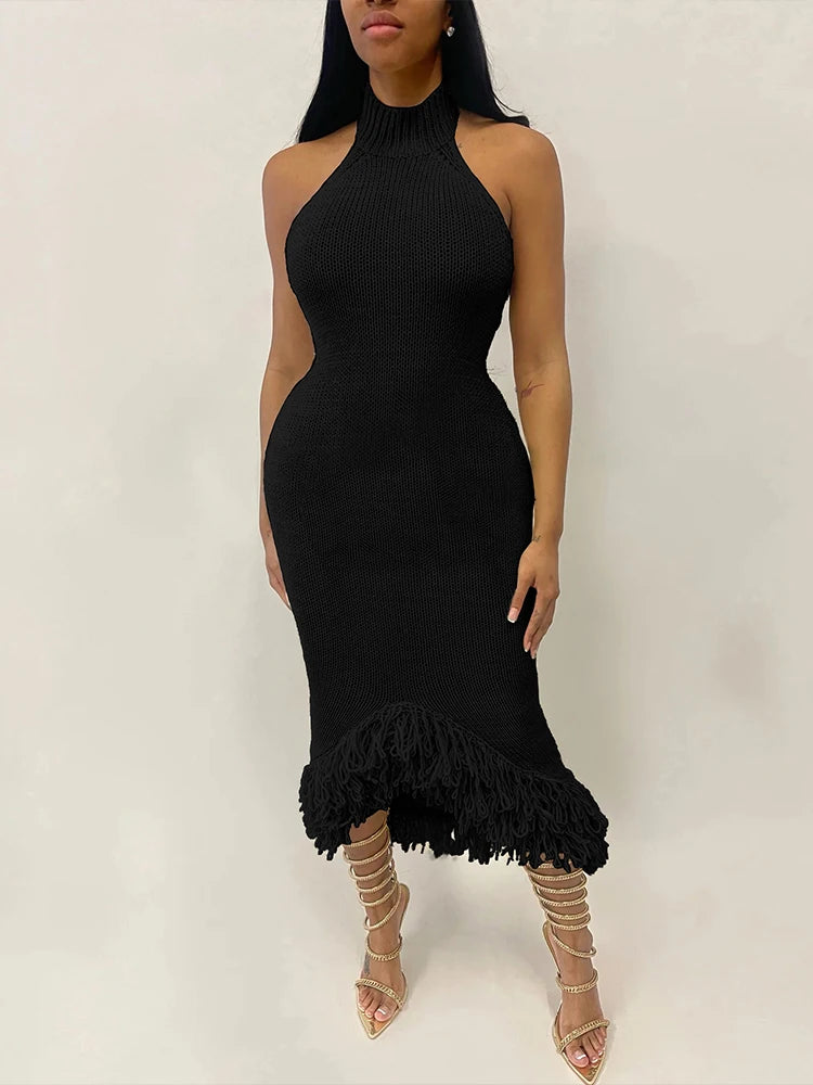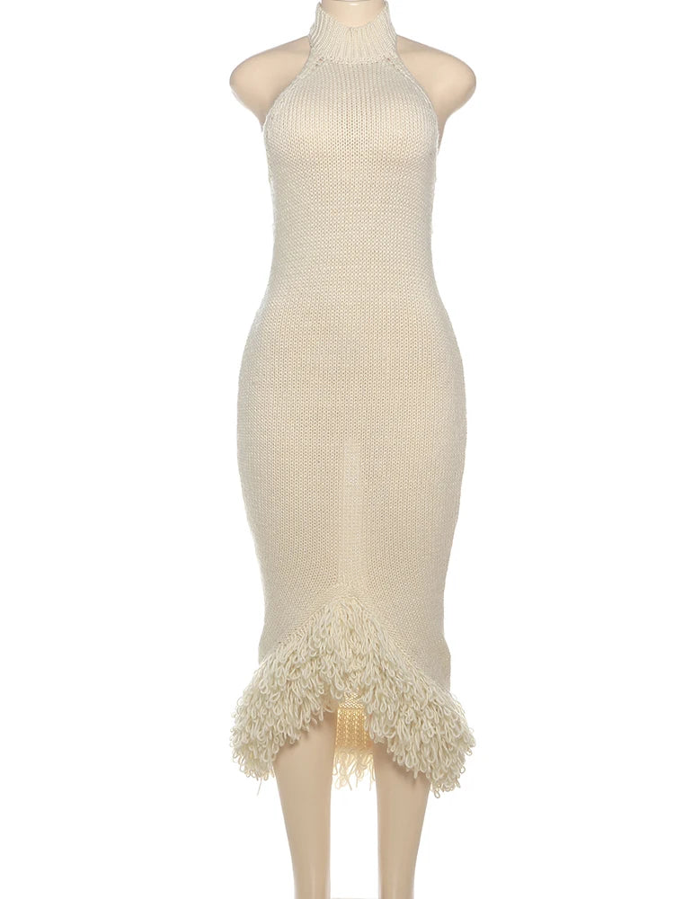 GETADME 이상한 고양이 니트 백리스 드레스 여성 민소매 홀터넥 여름 섹시 태슬 불규칙 헴 클럽웨어 스트레치 힙스터 파티 베스디소