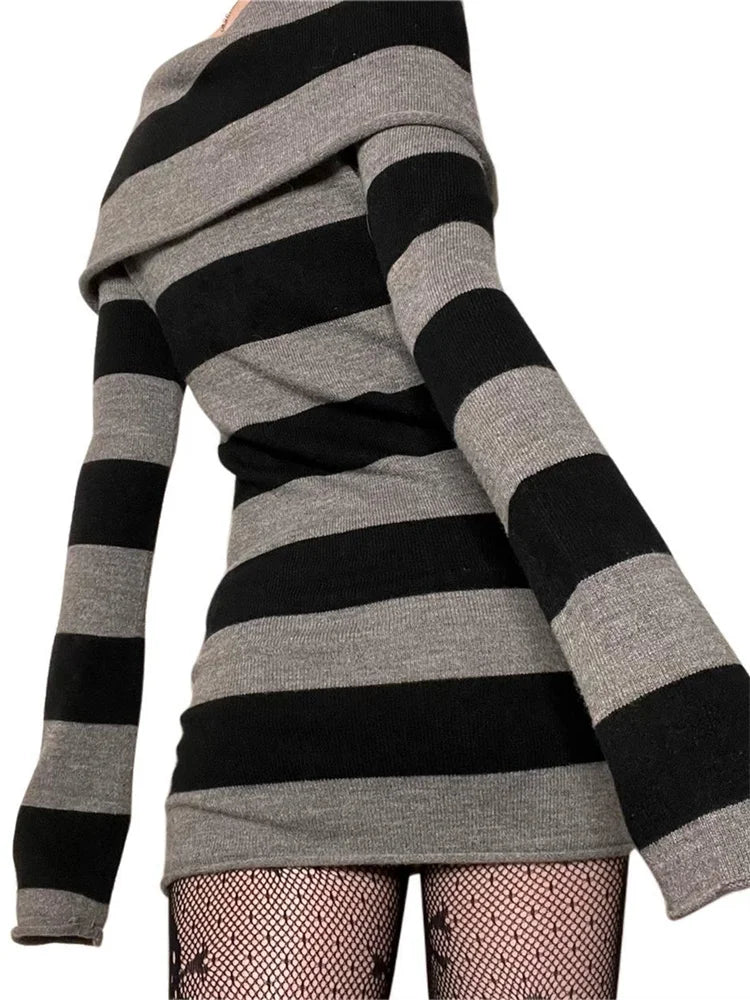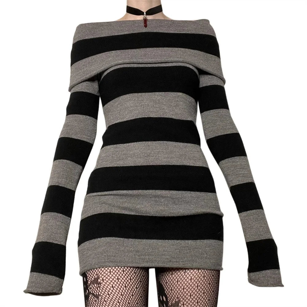 Getadme 여성 가을 ​​드레스 스트라이프 보트넥 긴팔 바디콘 숏 드레스 Y2K 고딕 랩 힙 파티 드레스