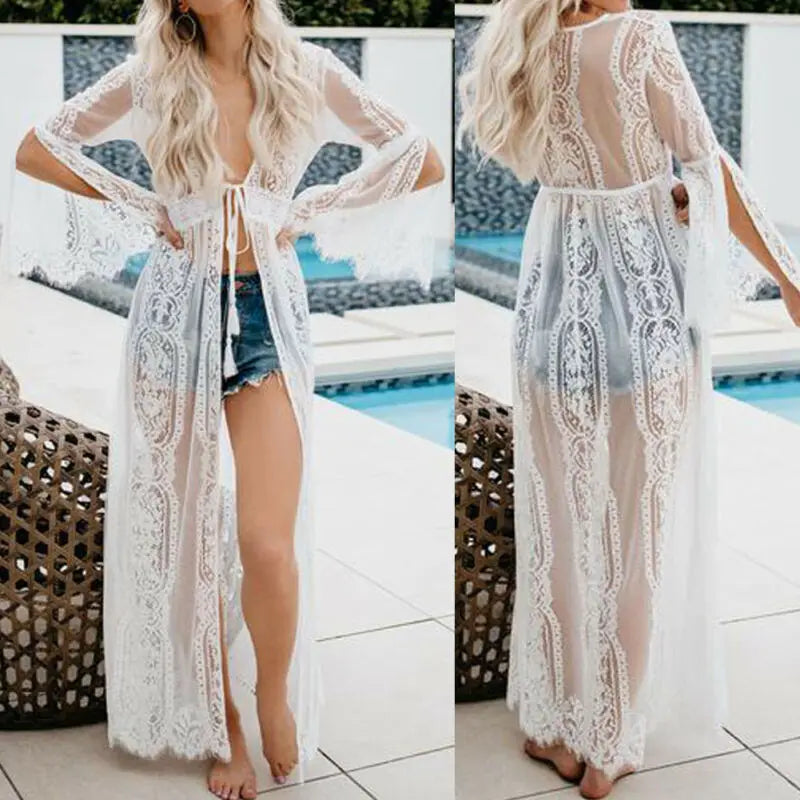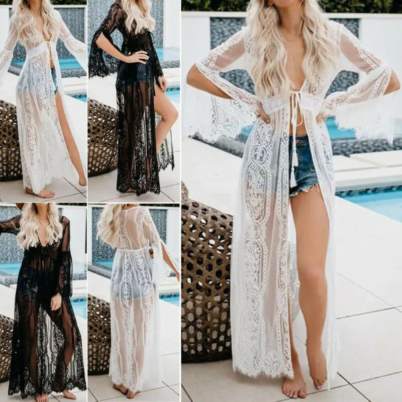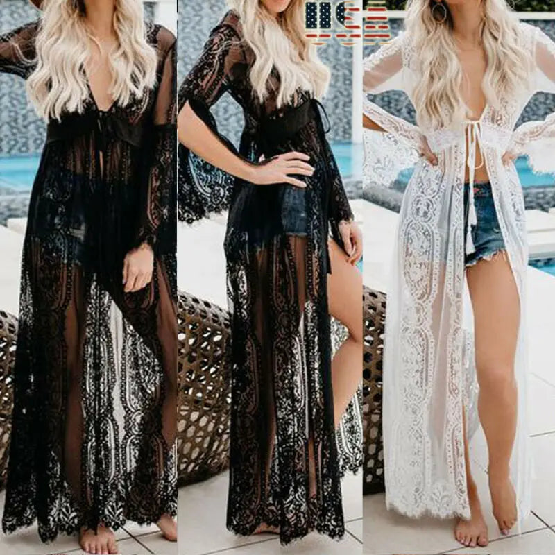GETADME 여성 보헤미안 레이스 기모노 셔츠 카디건 롱 비치 커버업 탑 드레스 블라우스 핫세일