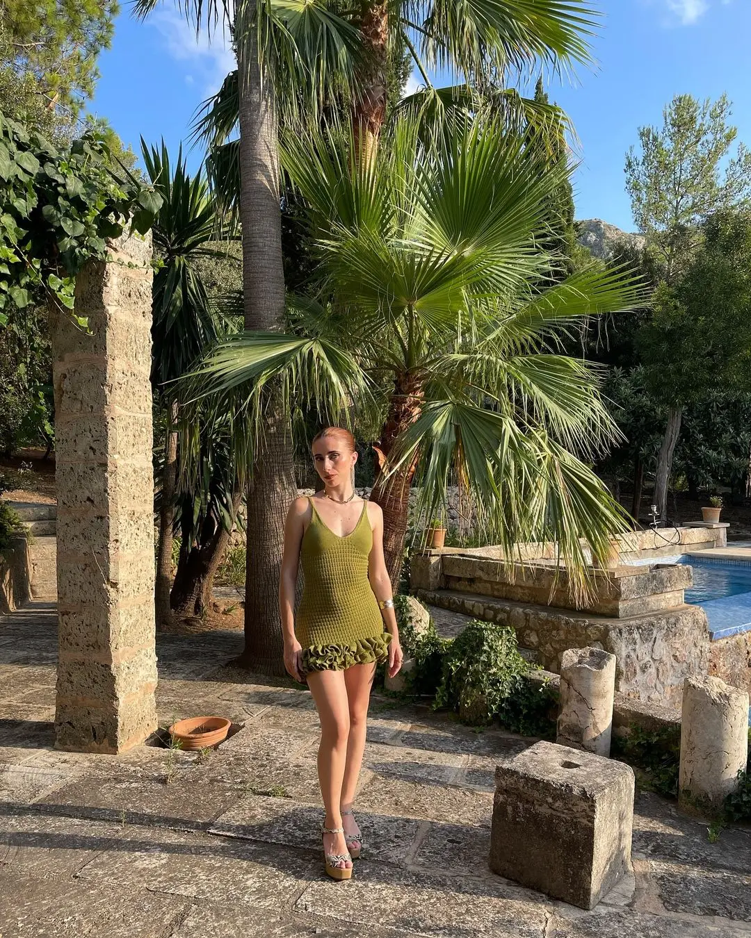 모델 번호: 여성 패션 그린 플리츠 밑단 니트 미니 드레스
