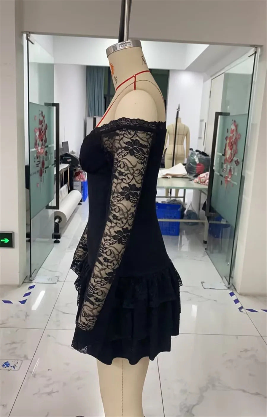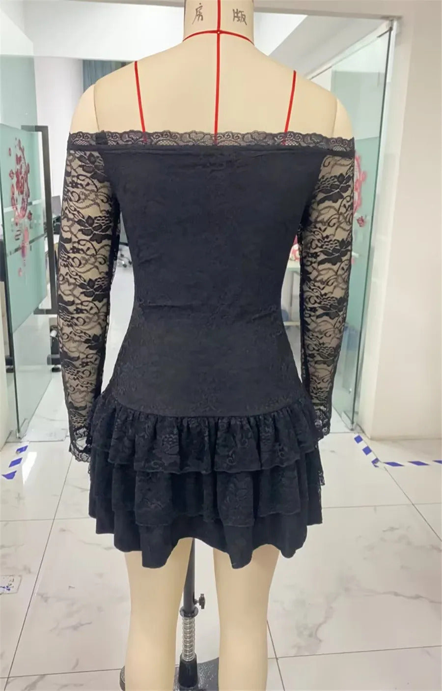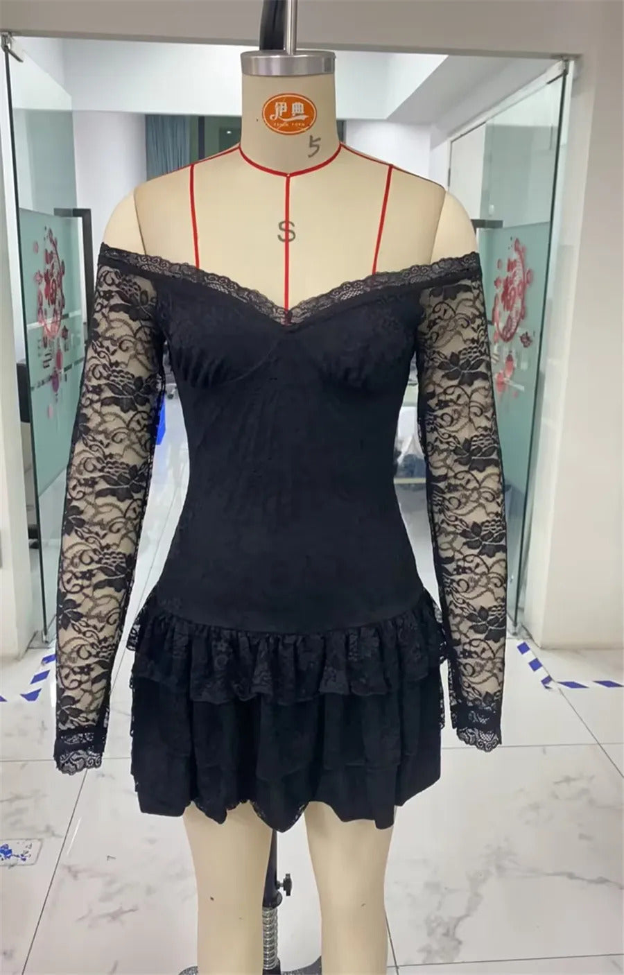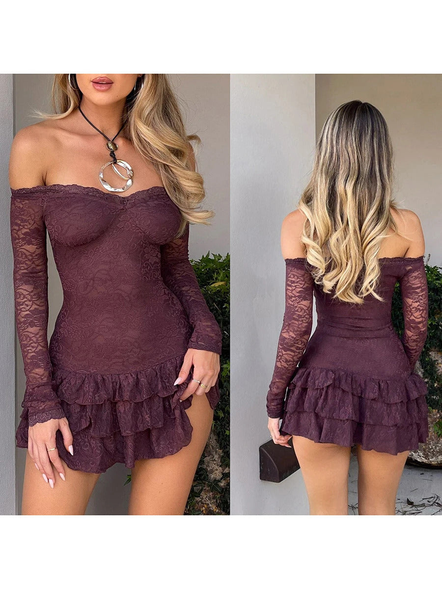 여성 미니 드레스 레이스 보트넥 오프숄더 긴팔 드레스 봄 가을 주름 장식 밑단 캐주얼 드레스