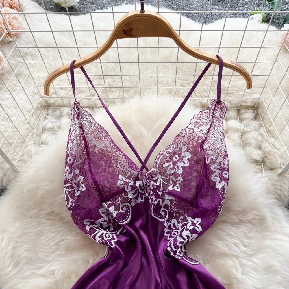 Getadme-여성용 나이트 드레스 민소매 등받이 없는 포르노 파자마 플로럴 레이스 에로틱 나이트웨어+끈 팬티 새틴 섹시 짧은 투명 드레스