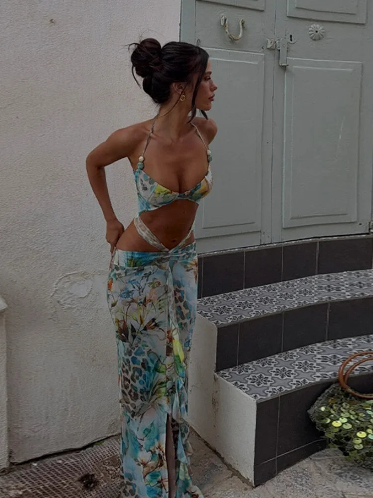 GETADME 여성 섹시 프린트 비키니 패치워크 러플 롱 드레스 패션 홀로우 오프 숄더 슬림 홀터 베스 티도 레이디 뉴 비치 클럽웨어