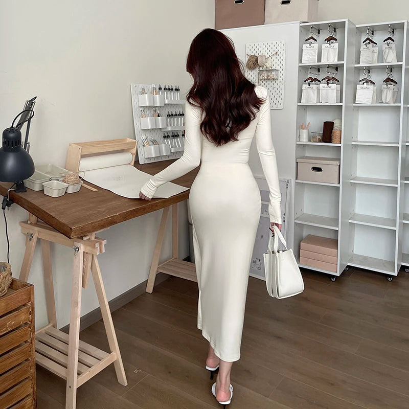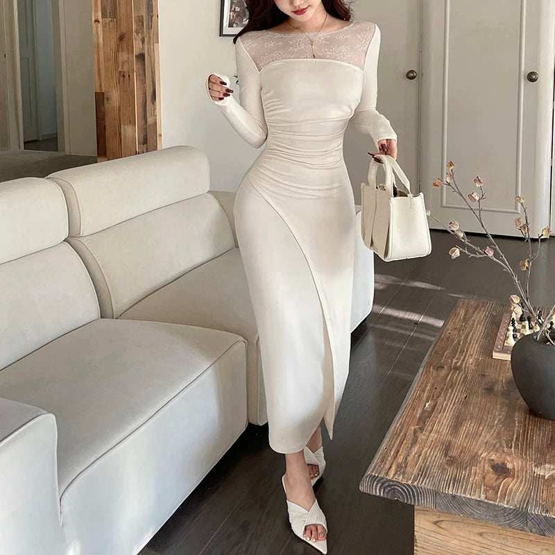 Getadme-여성 캐주얼 드레스 2024 새로운 우아한 기질 스플라이싱 레이스 스퀘어 넥 수축 플리츠 허리 브러시드 긴팔 드레스