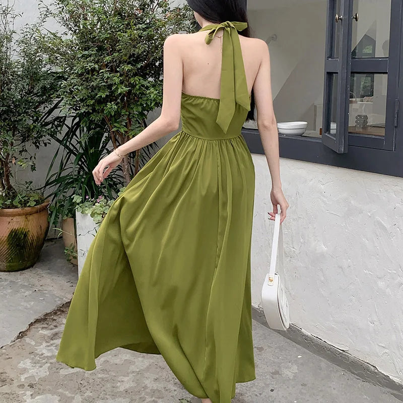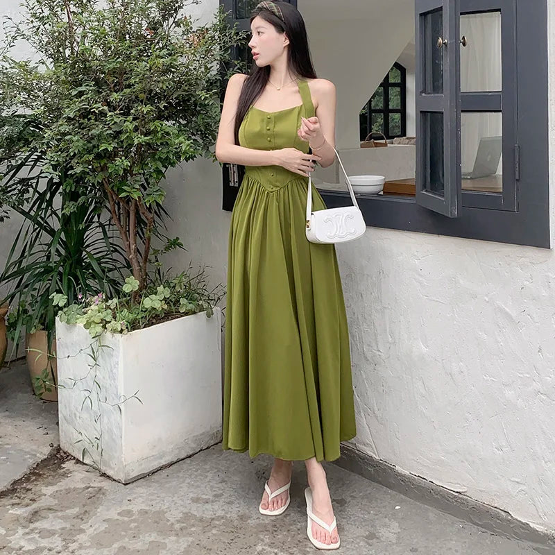 Getadme-여성용 우아한 드레스 2024년 봄 축제 신상품 유럽 및 미국산 아보카도 컬러 넥 A 진자 롱 스커트