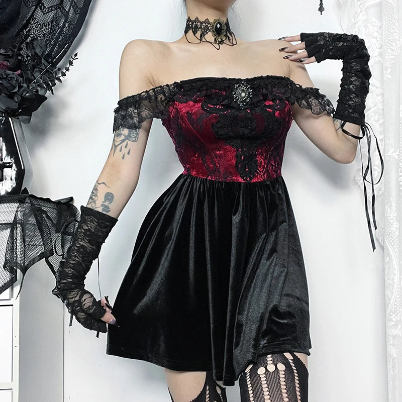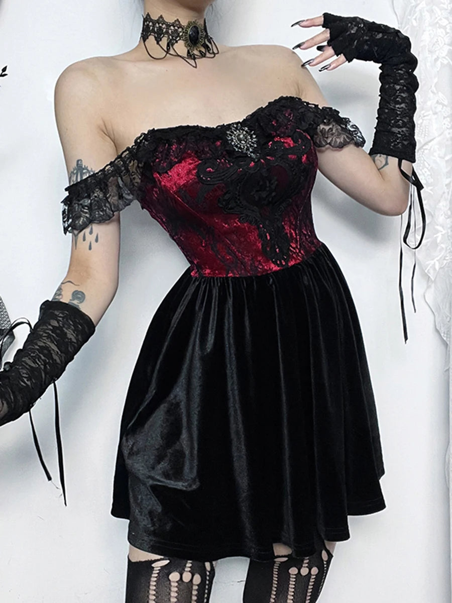 Getadme-여성용 고딕 스타일 짧은 드레스 새로운 허리 스플라이싱 짧은 다크 윈드 레이스 원숄더 퍼피 스윙 드레스 여성