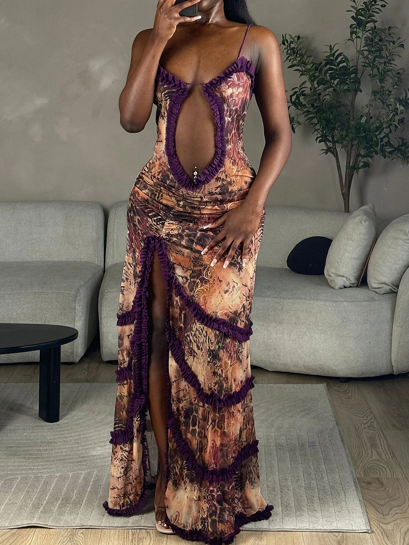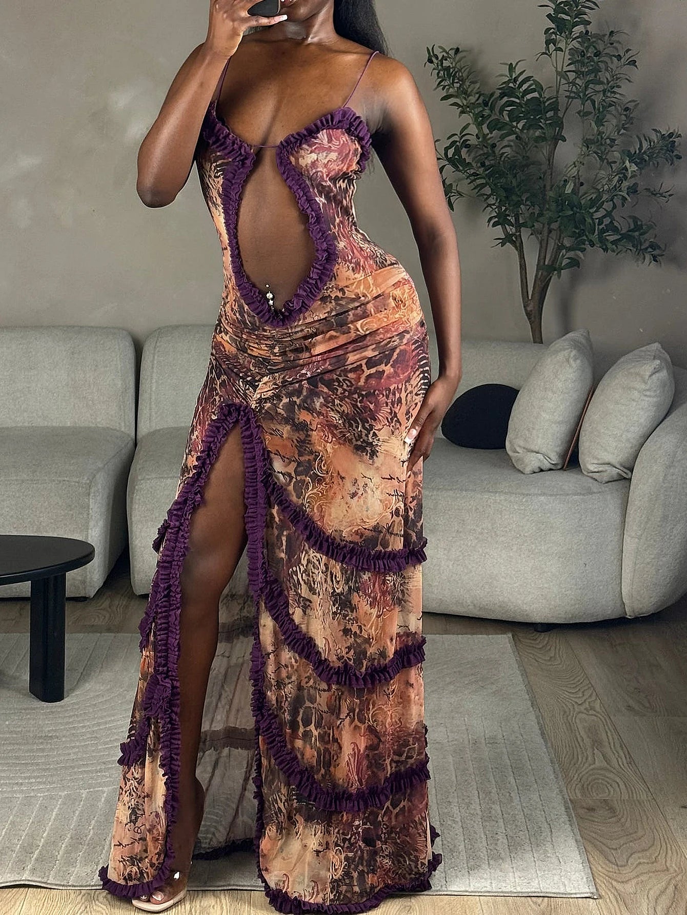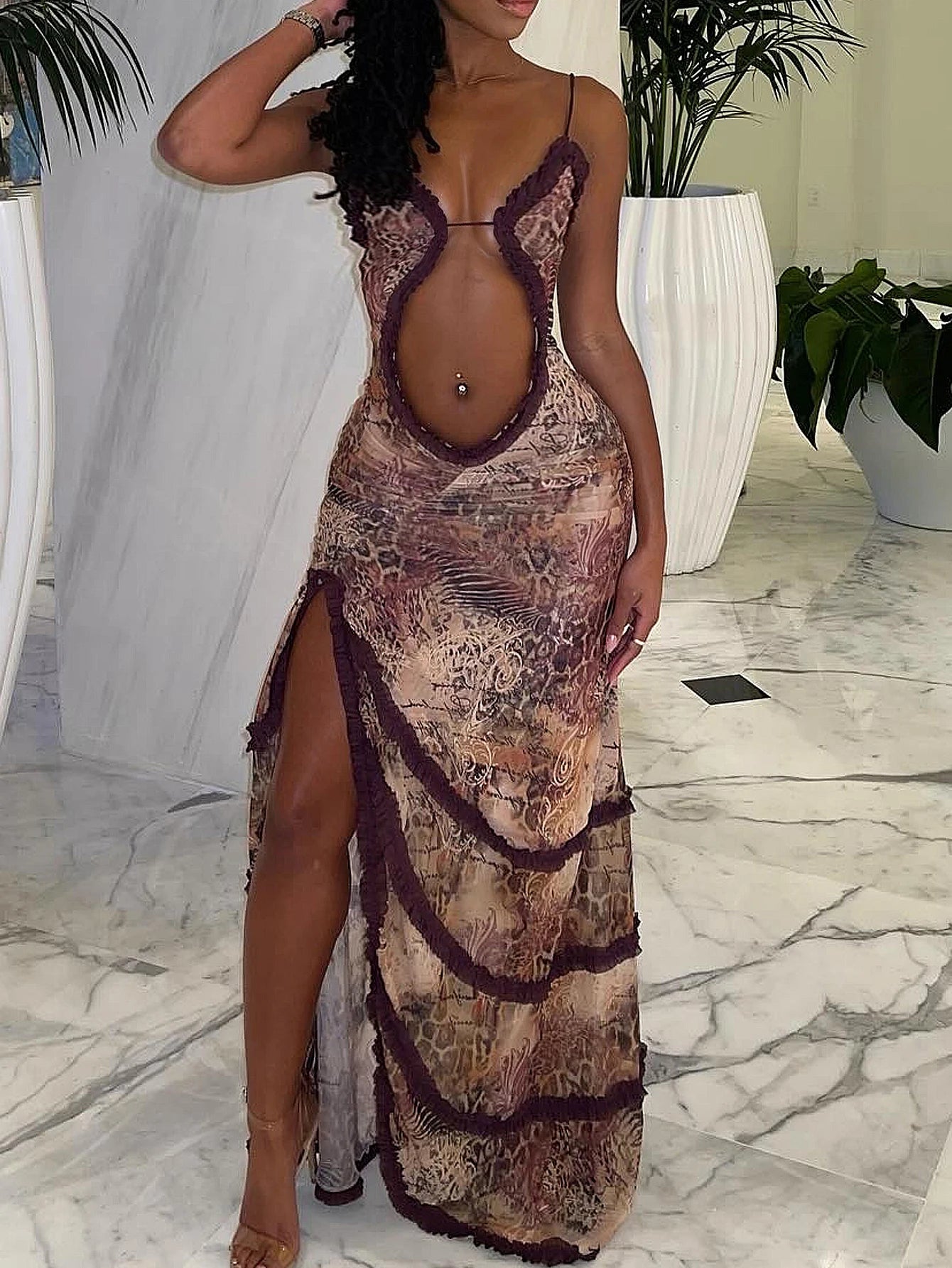 GETADME 여성용 섹시 라인 홀로우 하이 슬릿 드레스, 플리츠 레이스 슬릿 드레스