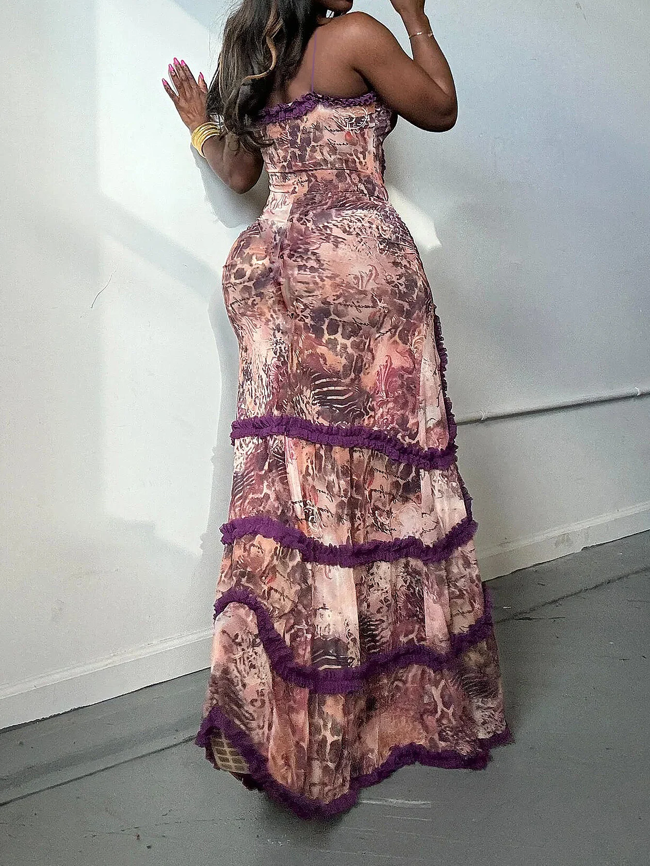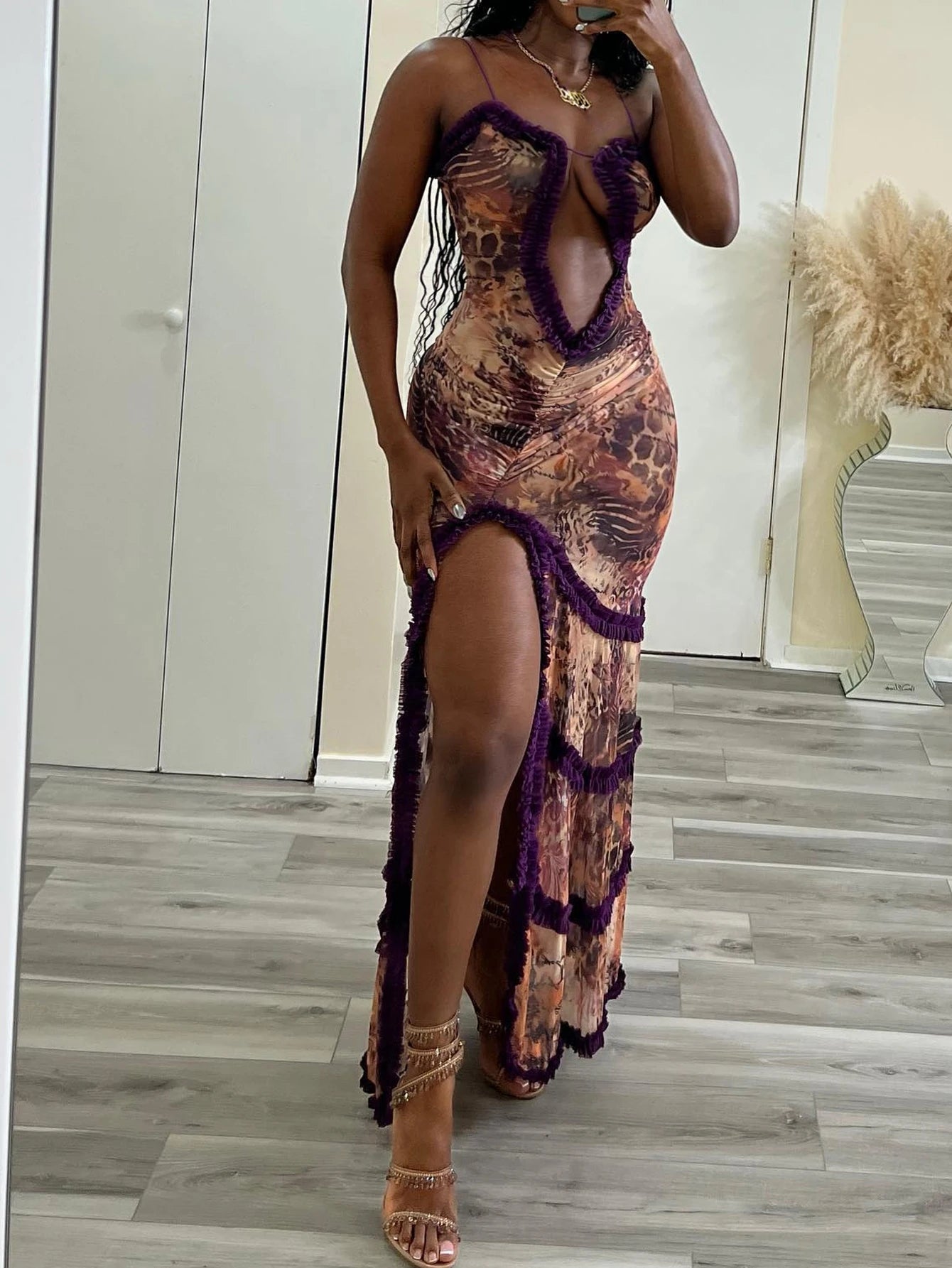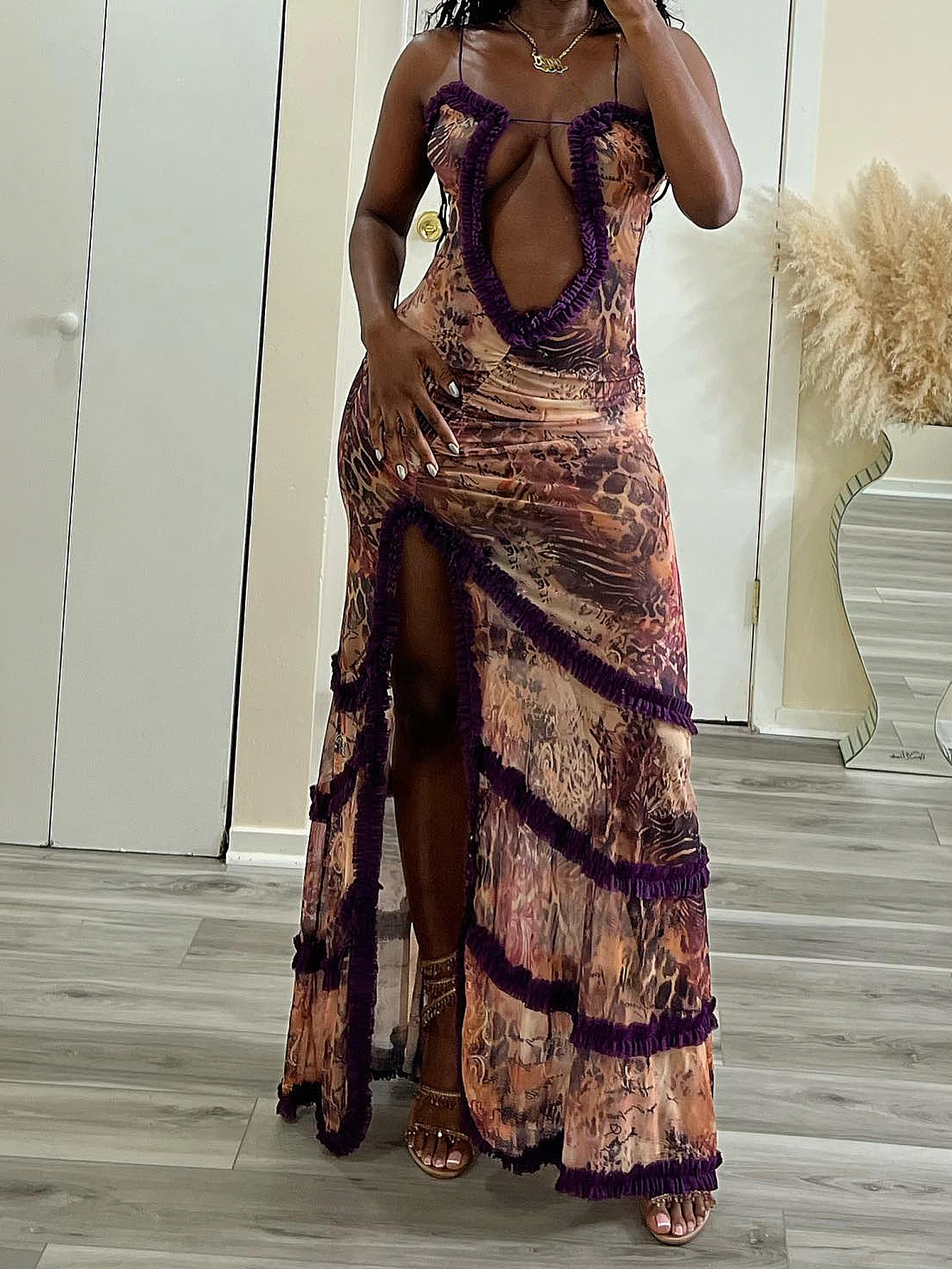 GETADME 여성용 섹시 라인 홀로우 하이 슬릿 드레스, 플리츠 레이스 슬릿 드레스