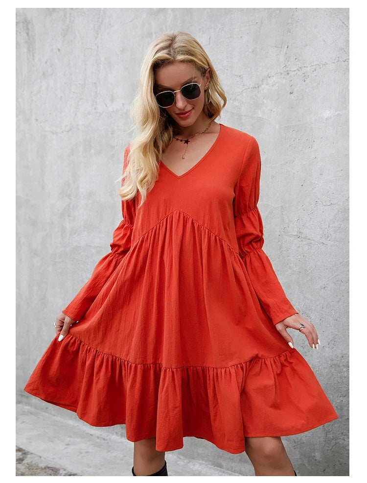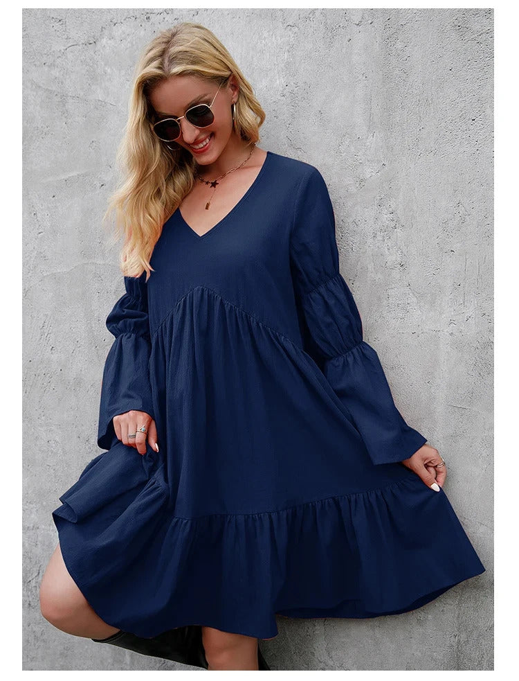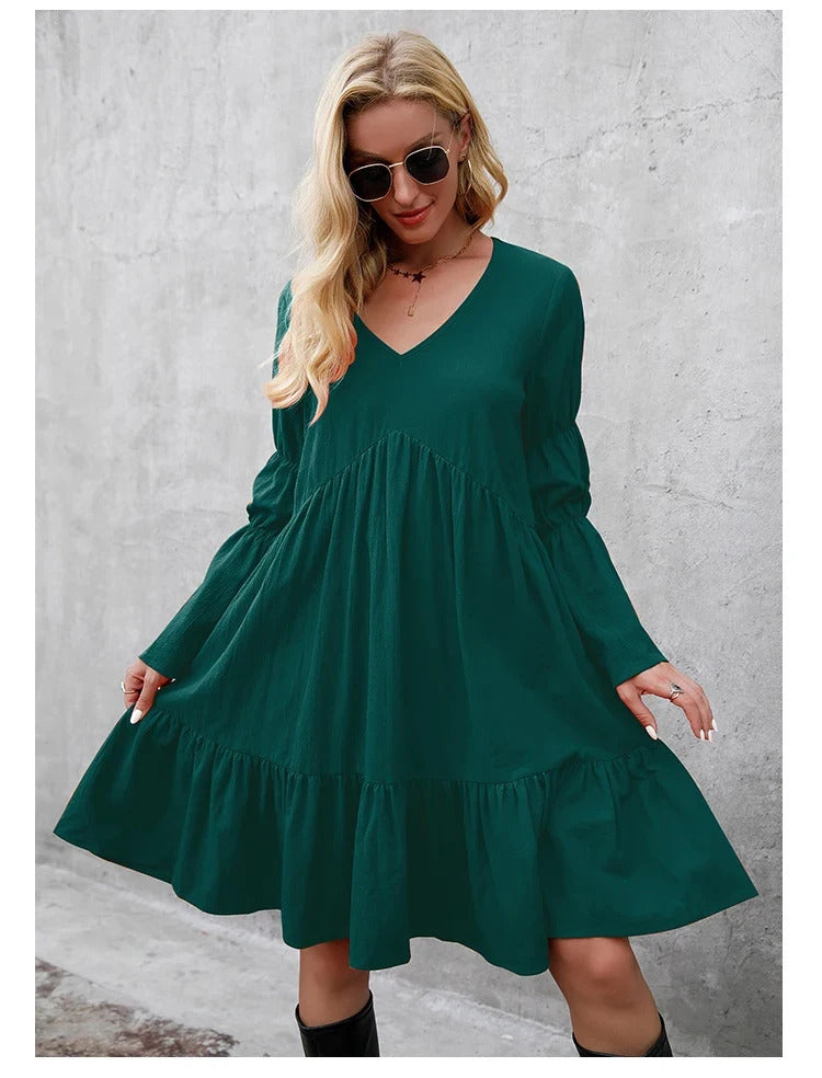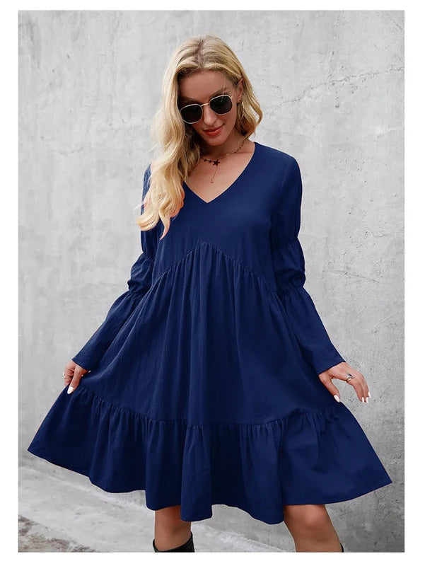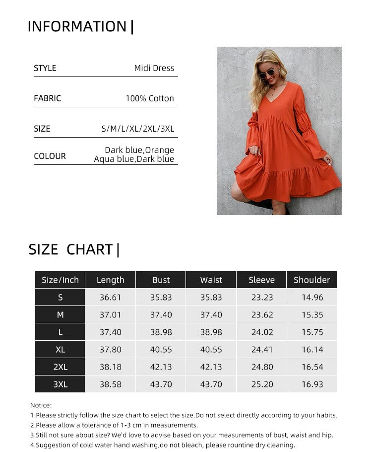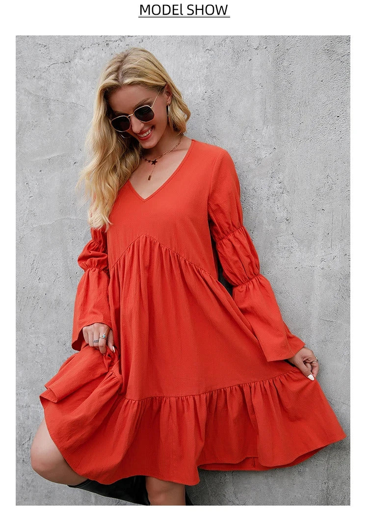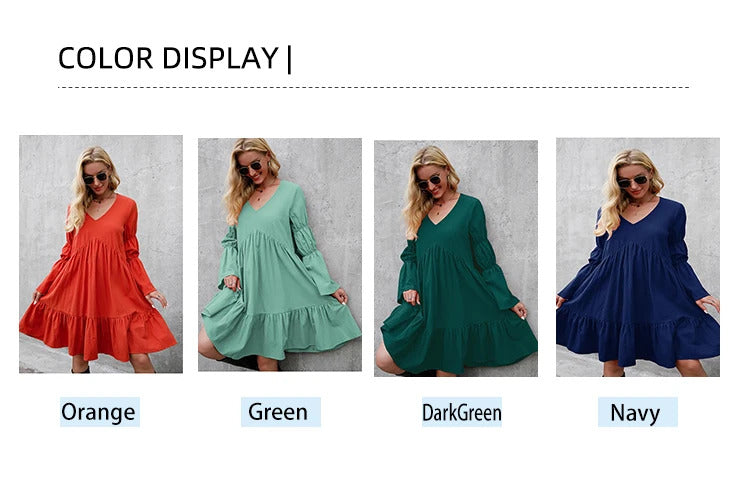 Getadme 여성 캐주얼 긴팔 드레스 V넥 루즈 플로잉 드레스 러플 인형 드레스 코튼 드레스 티셔츠 드레스