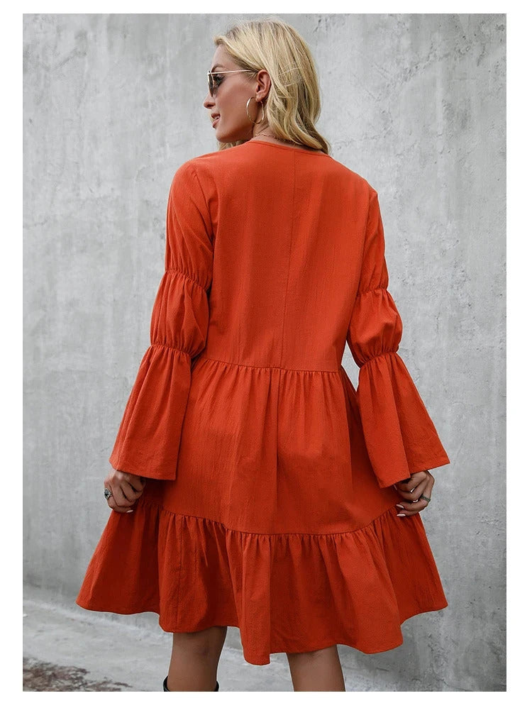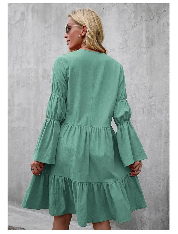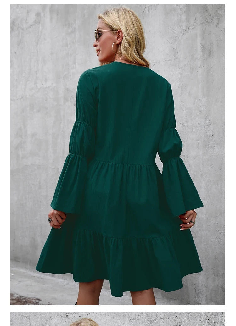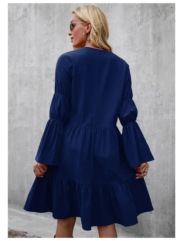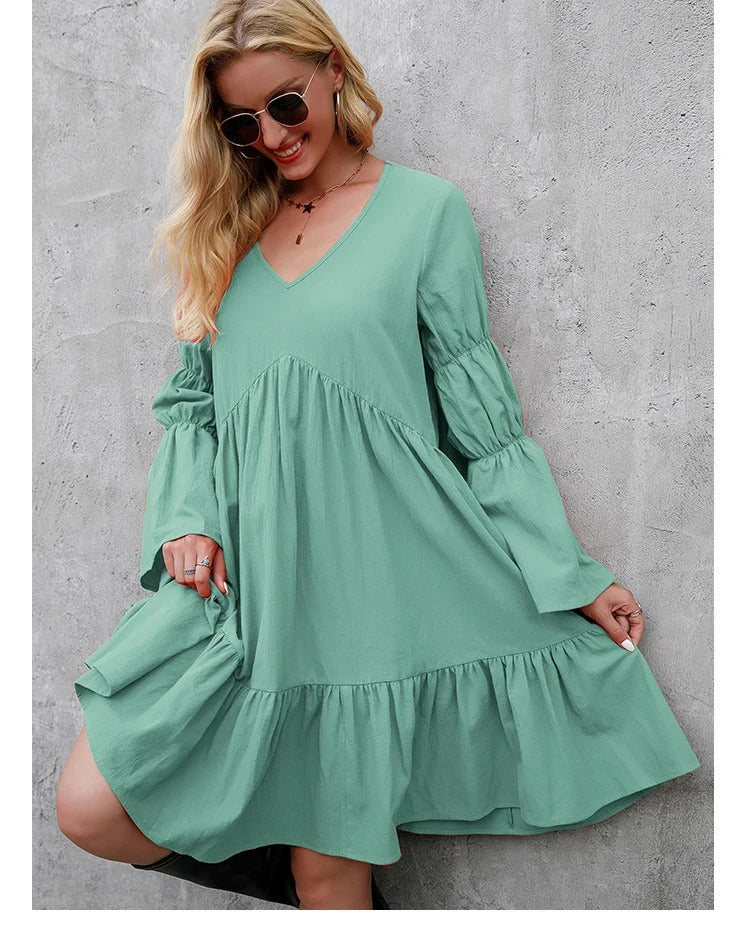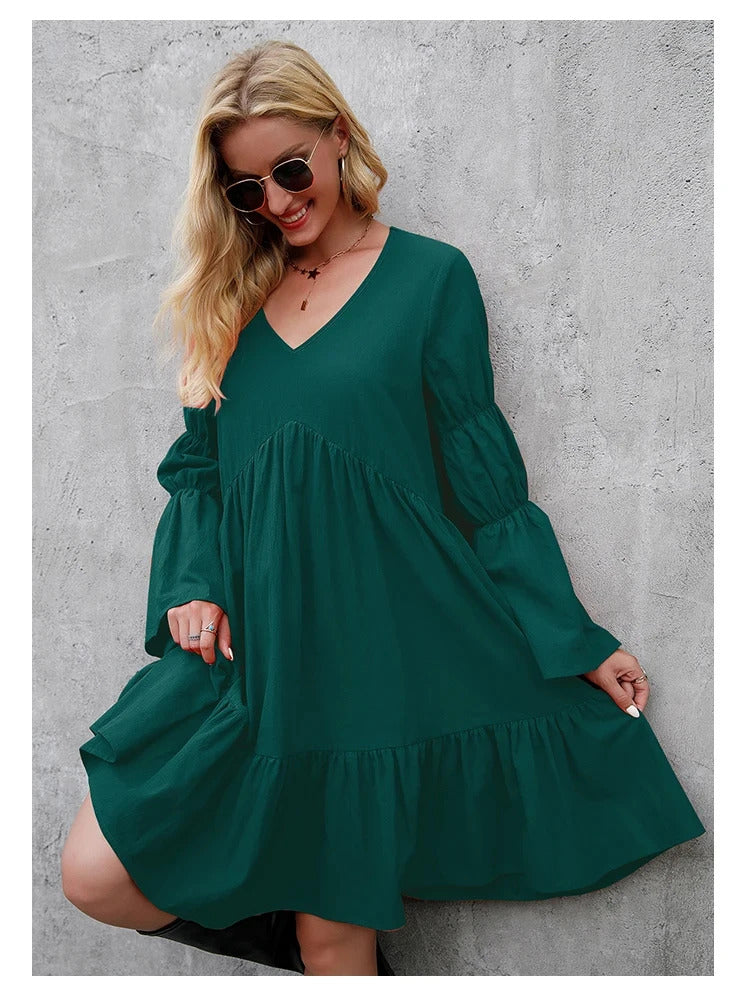 Getadme 여성 캐주얼 긴팔 드레스 V넥 루즈 플로잉 드레스 러플 인형 드레스 코튼 드레스 티셔츠 드레스