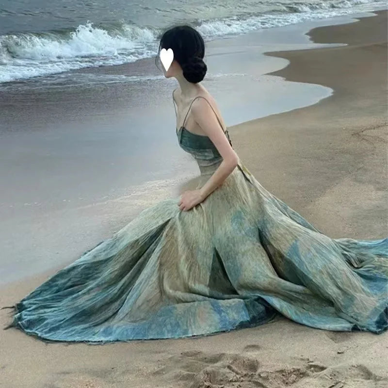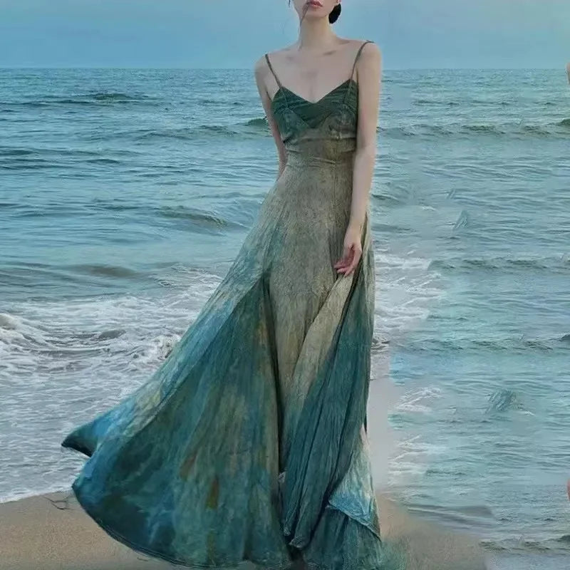 Getadme 고품질 보헤미안 여름 타이 다이 그라데이션 홀리데이 비치 가운 프렌치 섹시 여성용 스파게티 스트랩 슬림 허리 백리스 롱 드레스