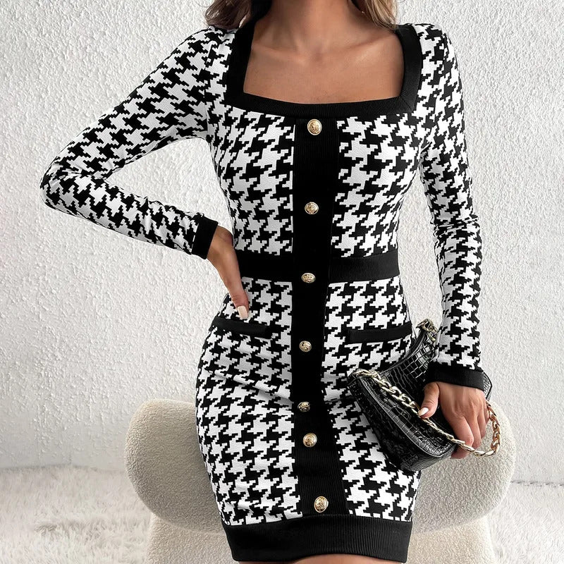 새로운 스퀘어 칼라 긴팔 자카드 플레드 스트레치 타이트 스킨타이트 붕대 그룹 기질 시니어 센스 드레스