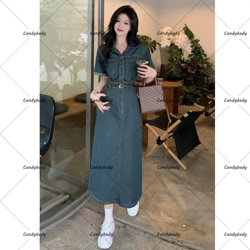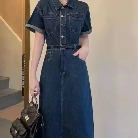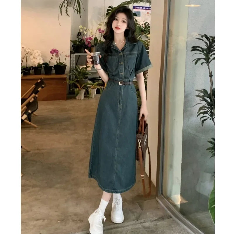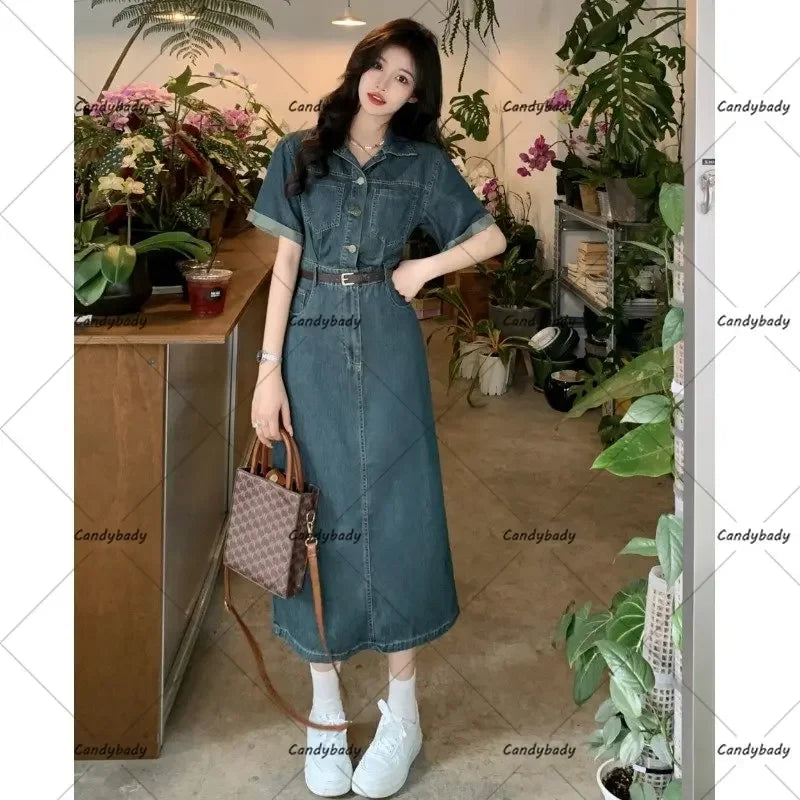 레트로 홍콩 스타일 카우보이 드레스 여름 니치 디자인 고급 기질 프랑스 반팔 롱 스커트 여성 의류