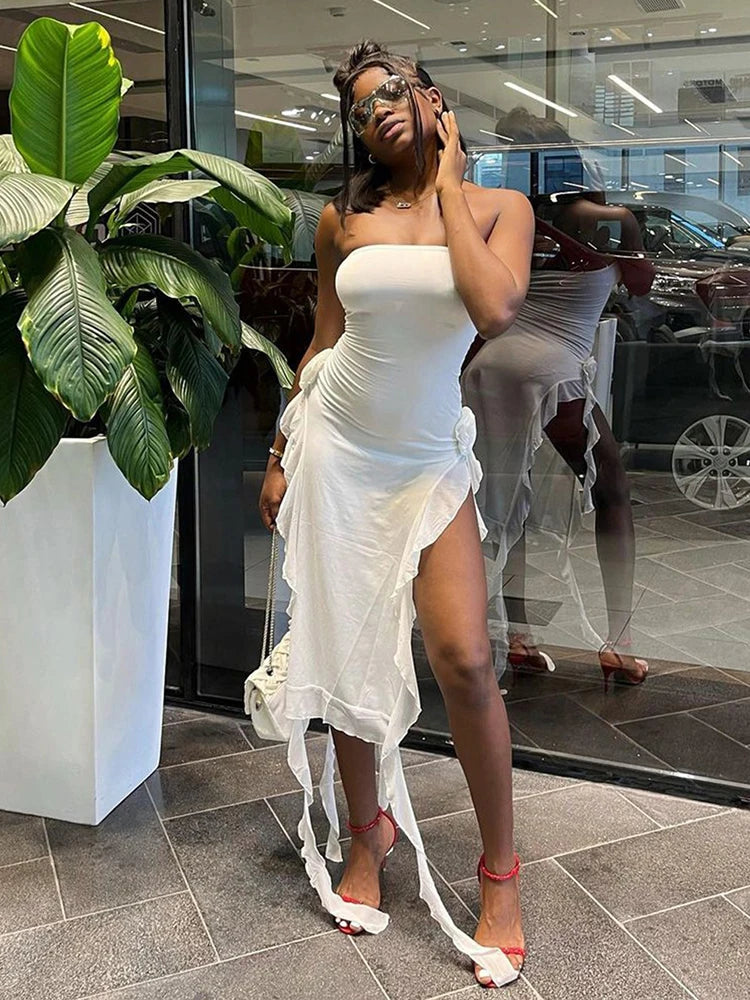 섹시 드레스 여성 여름 새로운 아플리케 바디콘 오프 숄더 스트랩리스 드레스 패션 캐주얼 스플릿 클럽 우아한 파티 드레스 여성