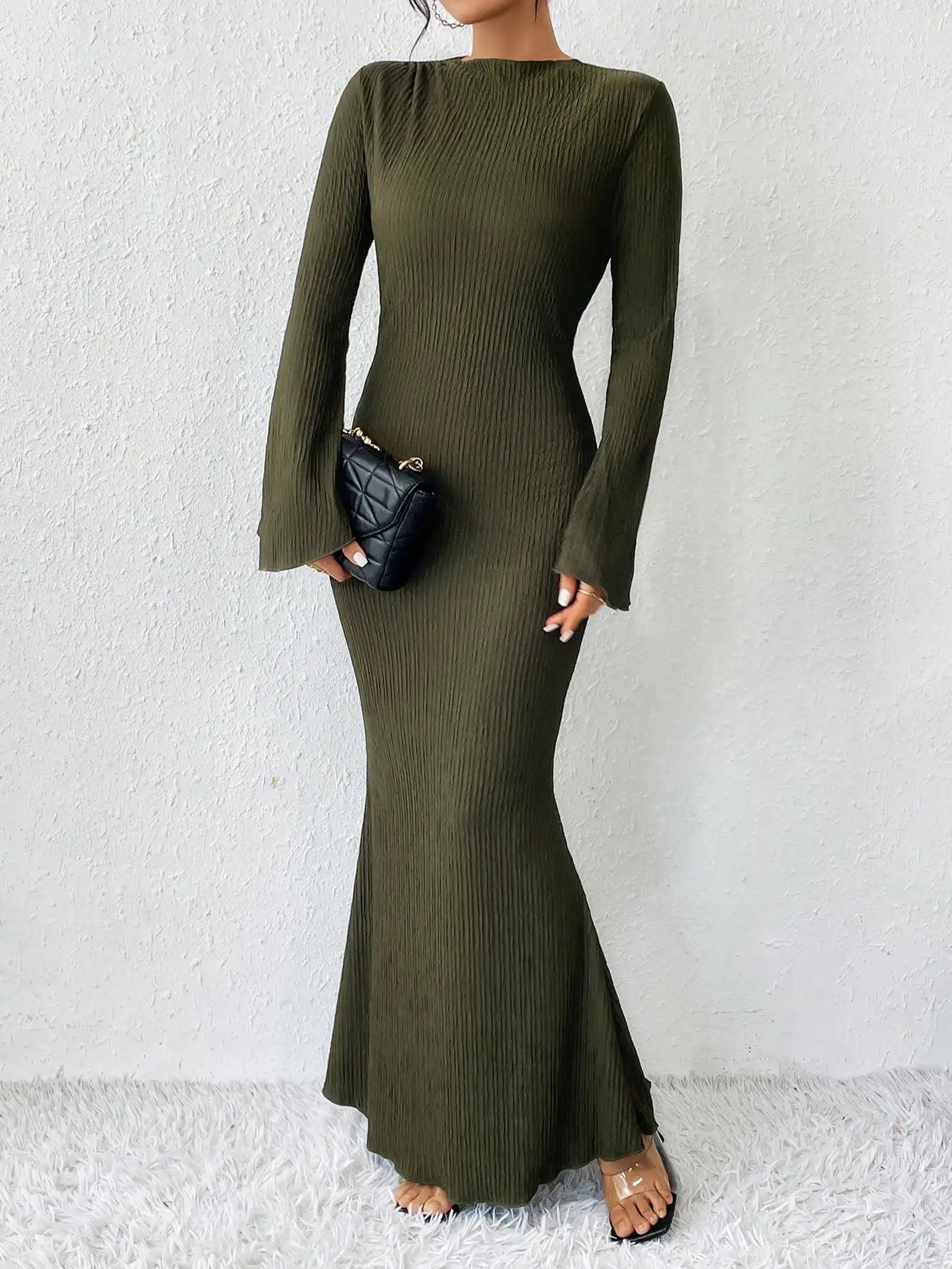 솔리드 플레어 슬리브 머메이드 드레스, 우아한 크루넥 플로어 렝스 슬림 드레스, 여성 의류