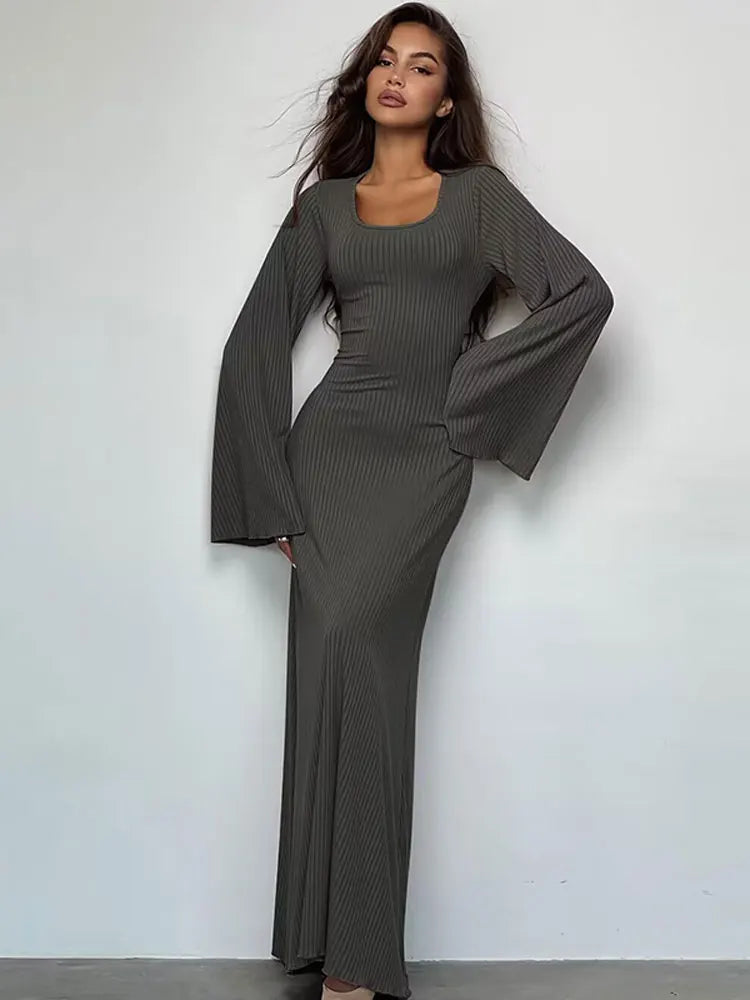 솔리드 리브 트럼펫 슬리브 맥시 드레스 백 레이스업 스트랩 우아한 캐주얼 가을 겨울 여성용 생일