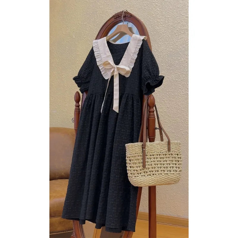 Getadme 여름 대학 스타일 달콤하고 귀여운 인형 칼라 여성 드레스 캐주얼 느슨한 A 라인 퍼프 슬리브 블랙 롱 드레스 소녀 학생용