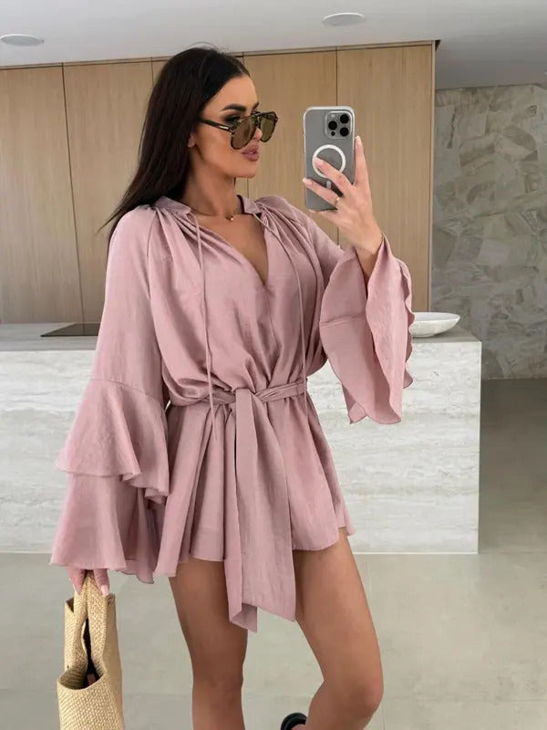 여성 V넥 불규칙 러플 레이스업 긴팔 드레스