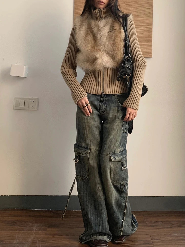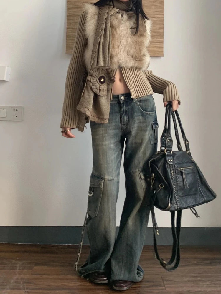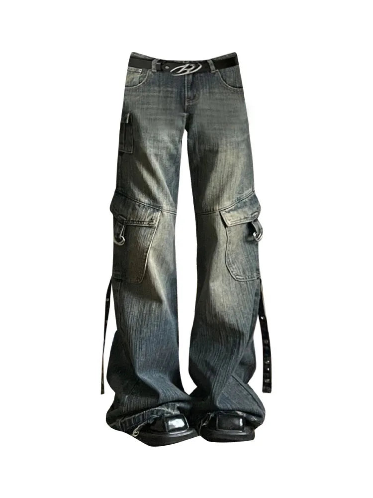 Getadme-아메리칸 레트로 워시드 블루 카고 팬츠 배기 포켓 아늑한 스트리트웨어 하이웨이스트 한국식 바지 힙합 2000년대 미학 하라주쿠