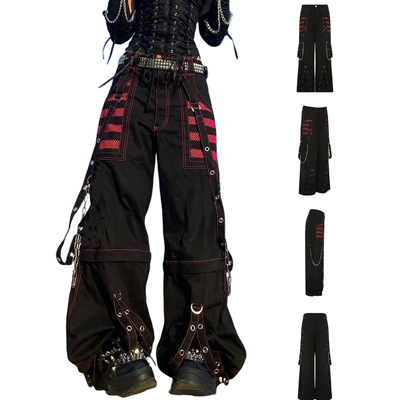 GETADME 고딕 여성 펑크 카고 팬츠 다크 아카데미아 에스테틱 하이웨이스트 배기 팬츠 포켓 포함 그런지 Y2K 스트리트웨어