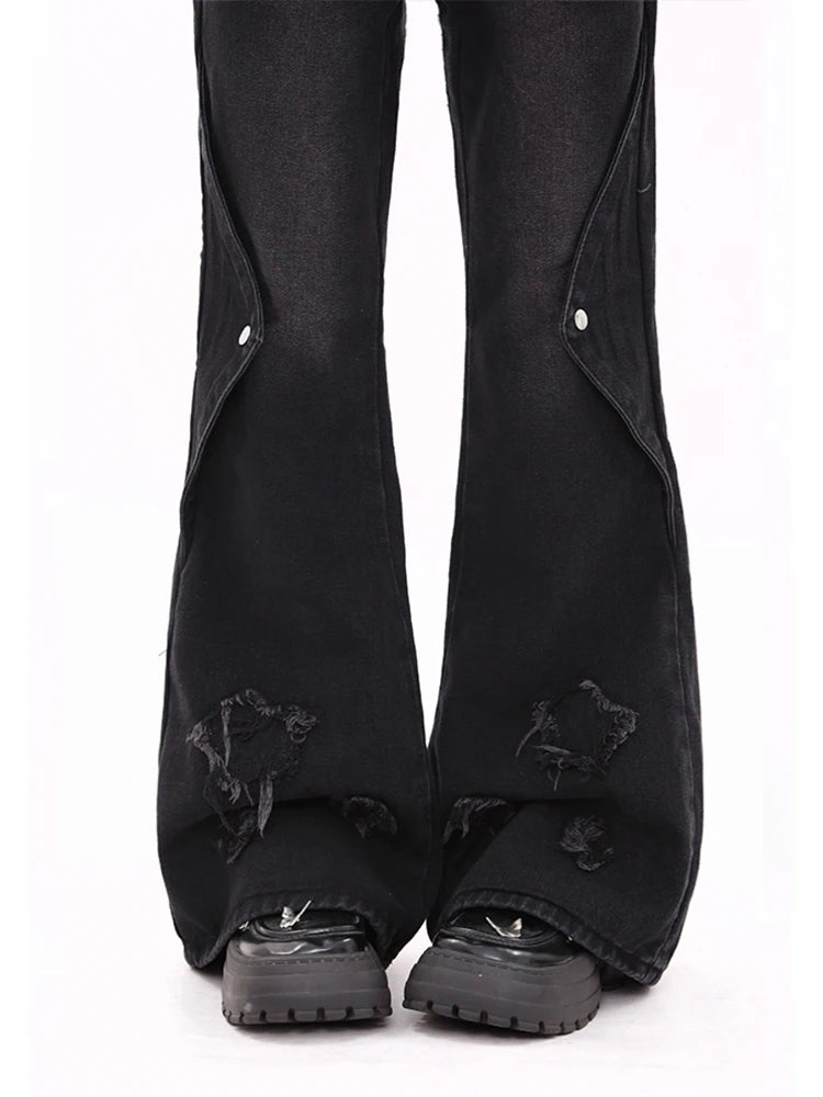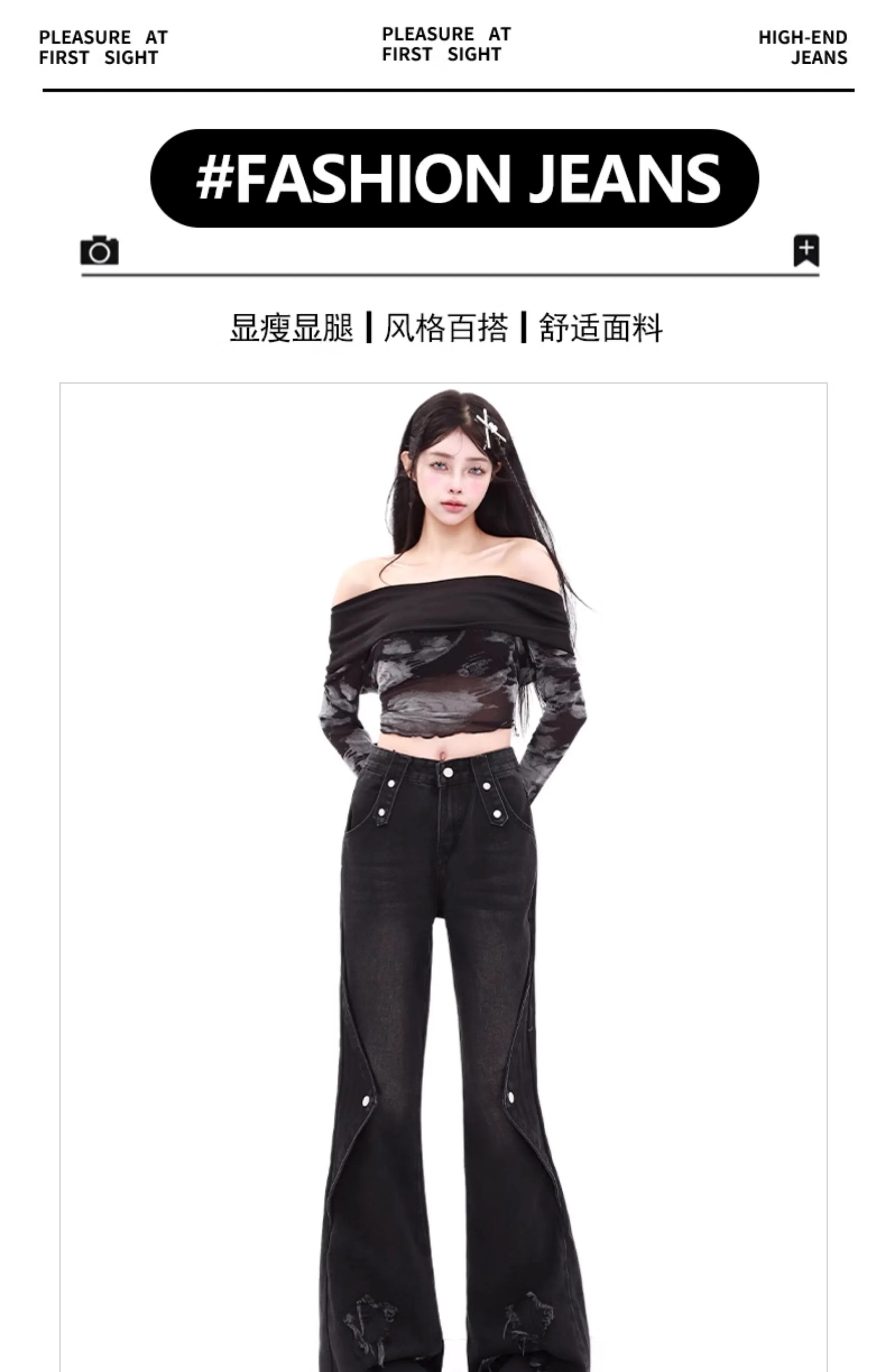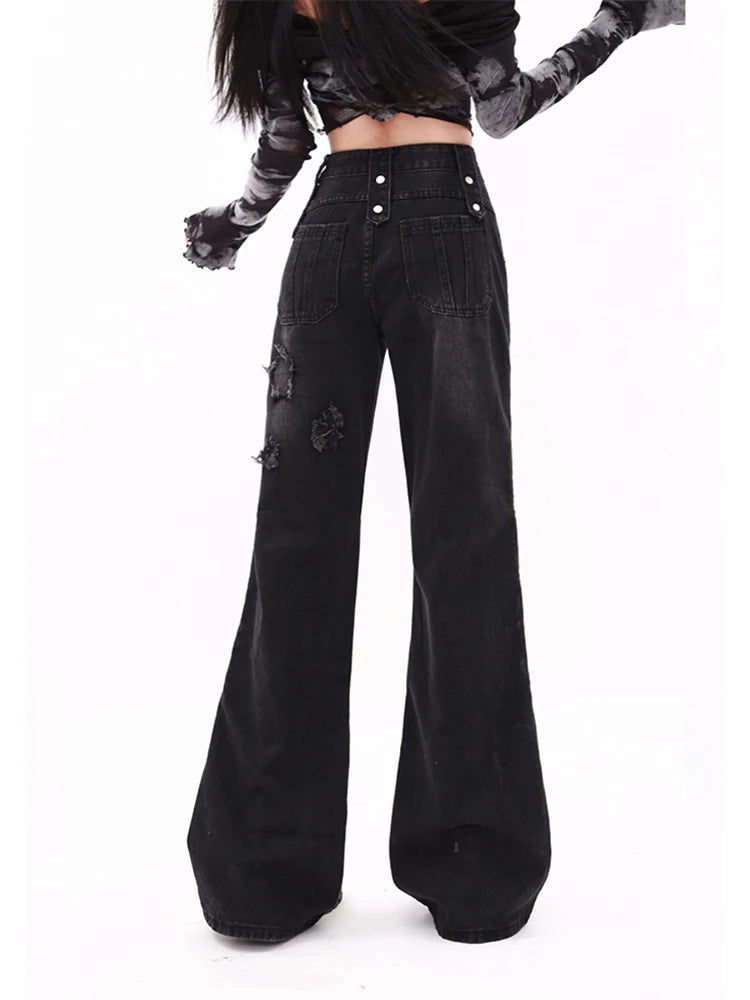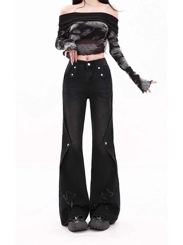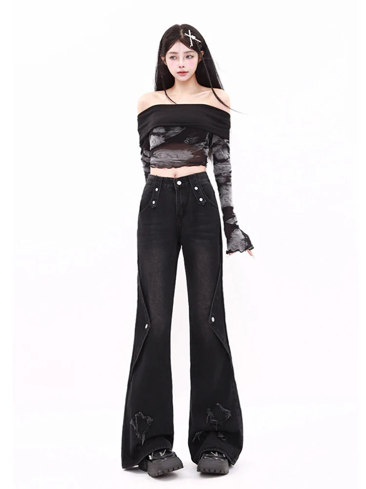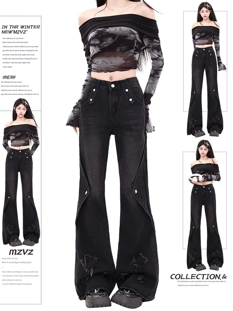 GETADME 여름 여성 한국 패션 블랙 플레어 진 Y2K 일본 스트리트웨어 로우 라이즈 벨 보텀 데님 팬츠 롱 팬츠 2000년대 K팝