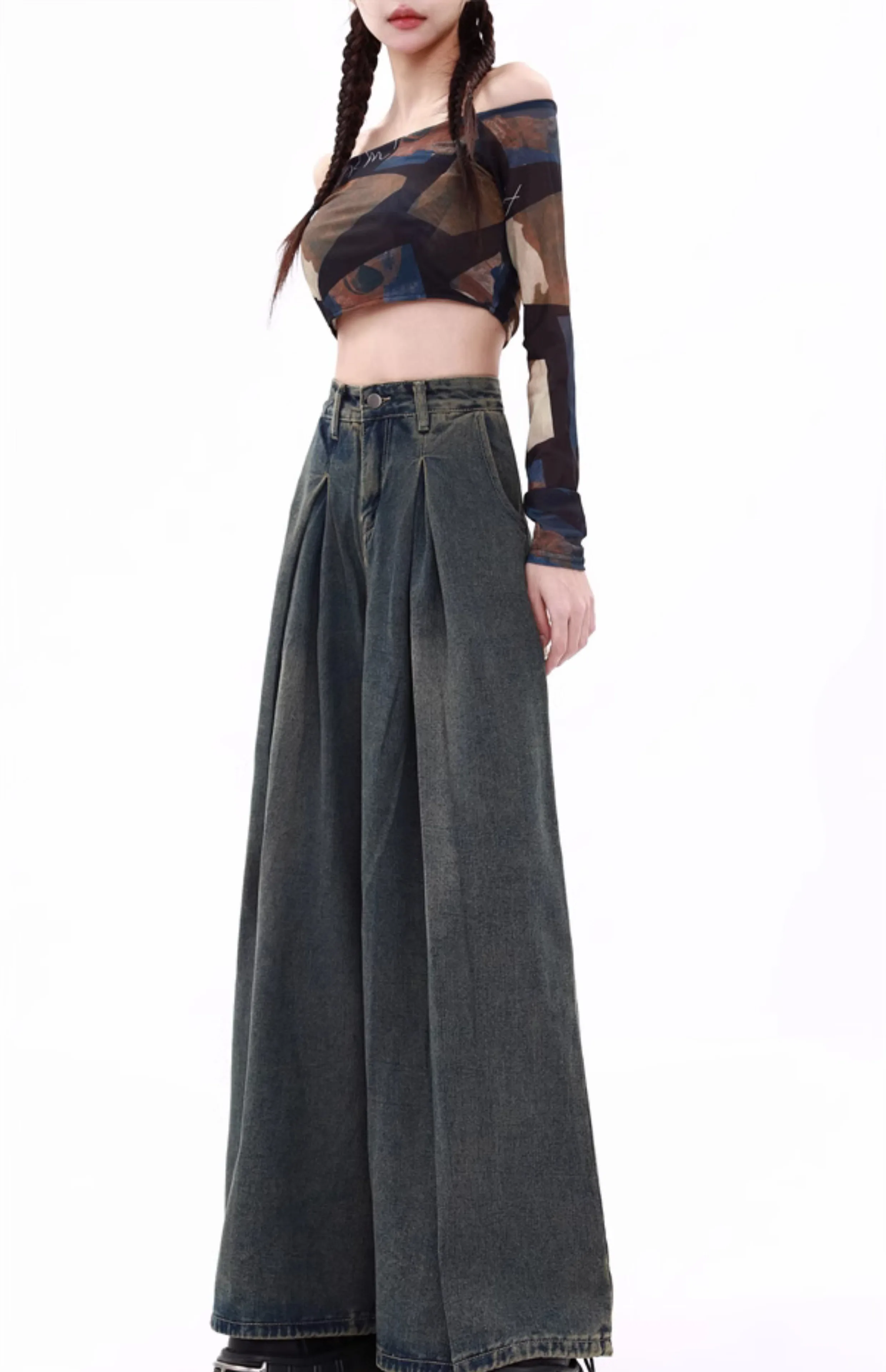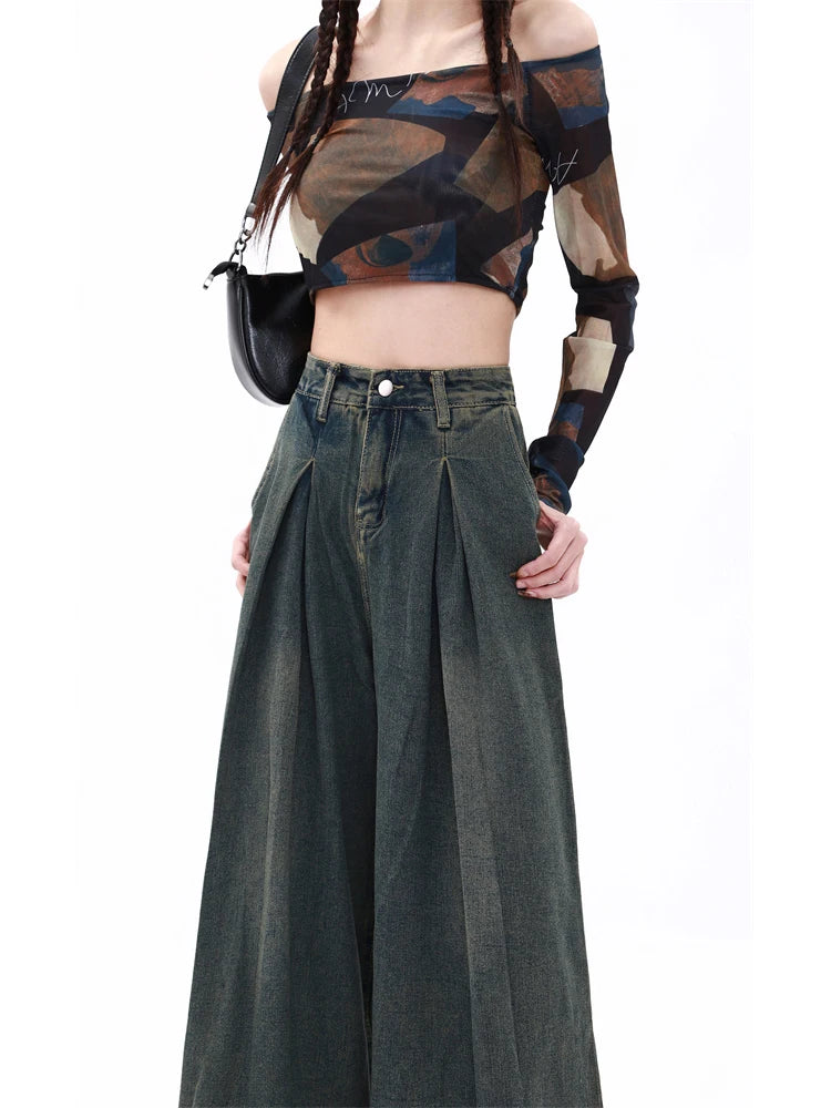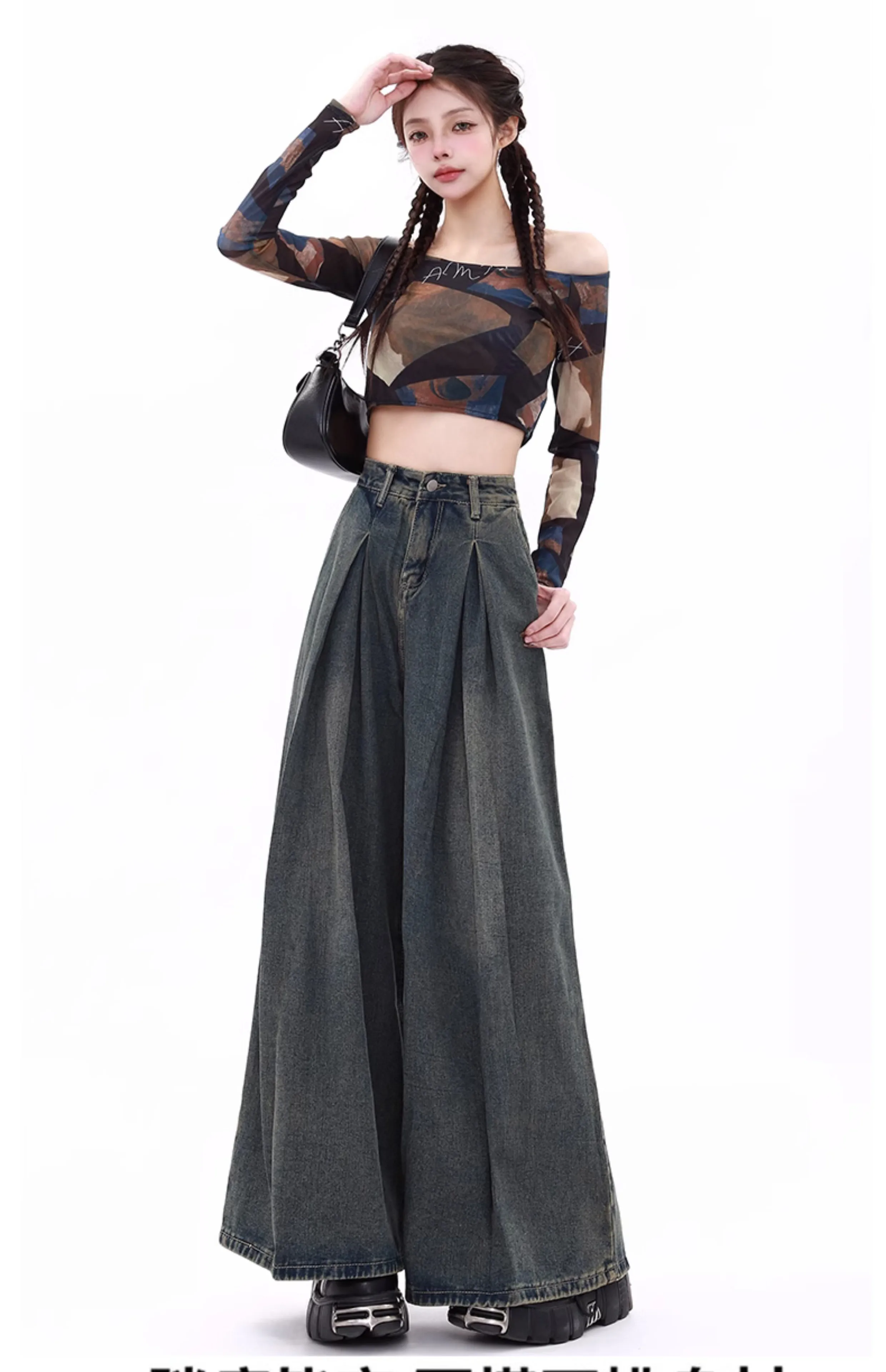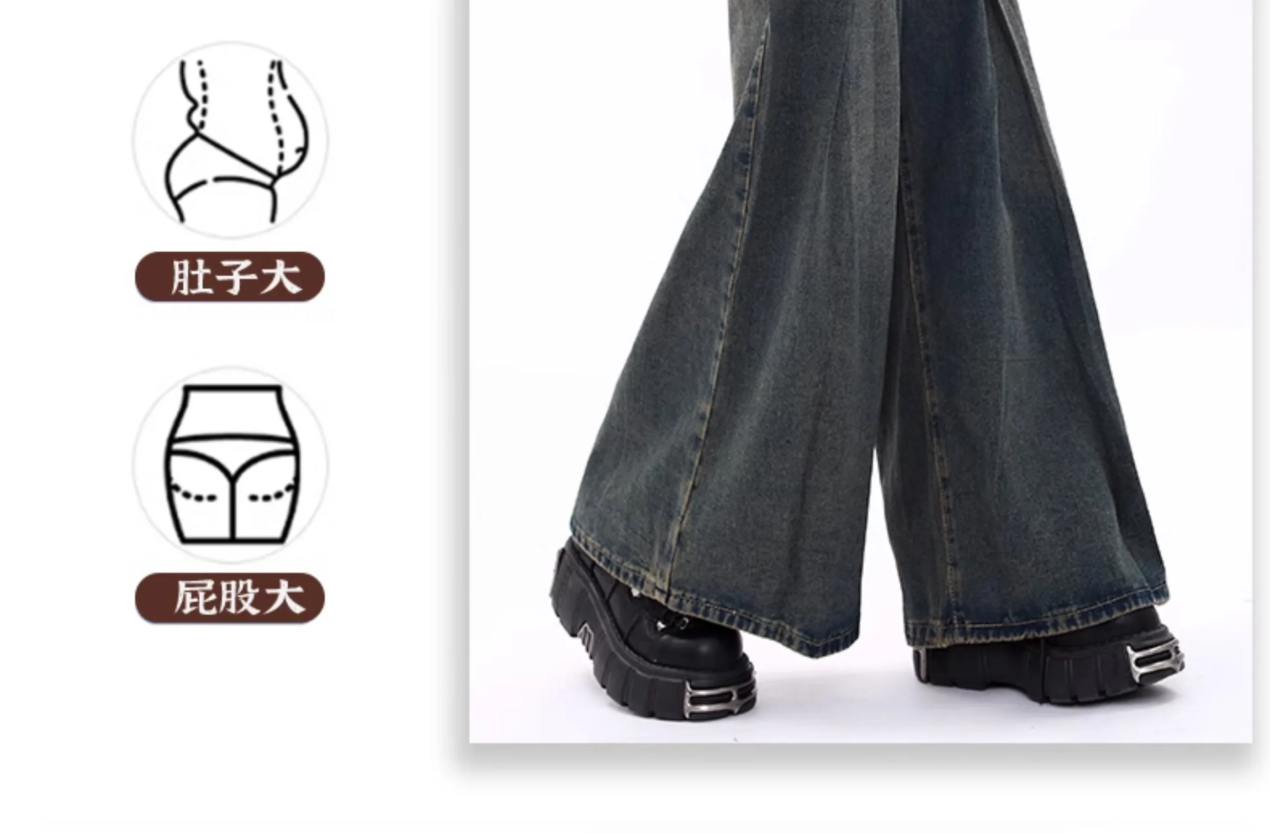 GETADME 여름 여성 한국 패션 플레어 플리츠 맘진 Y2K 일본 벨보텀 데님 팬츠 롱 팬츠 2000년대 K팝 고블린 코어