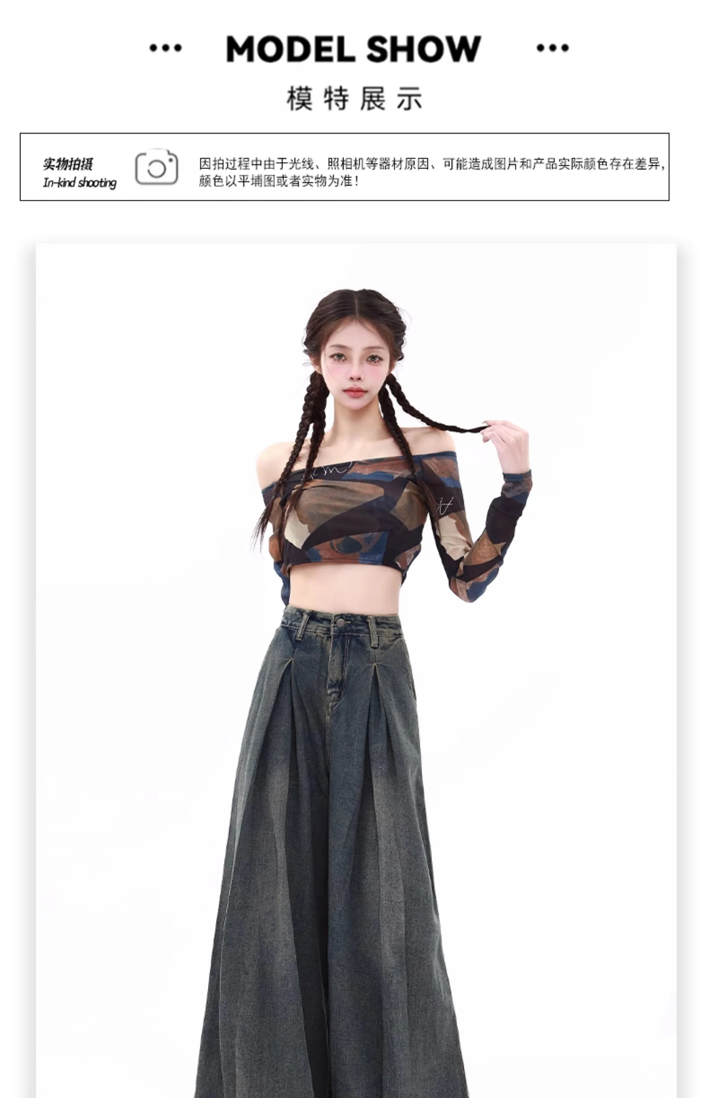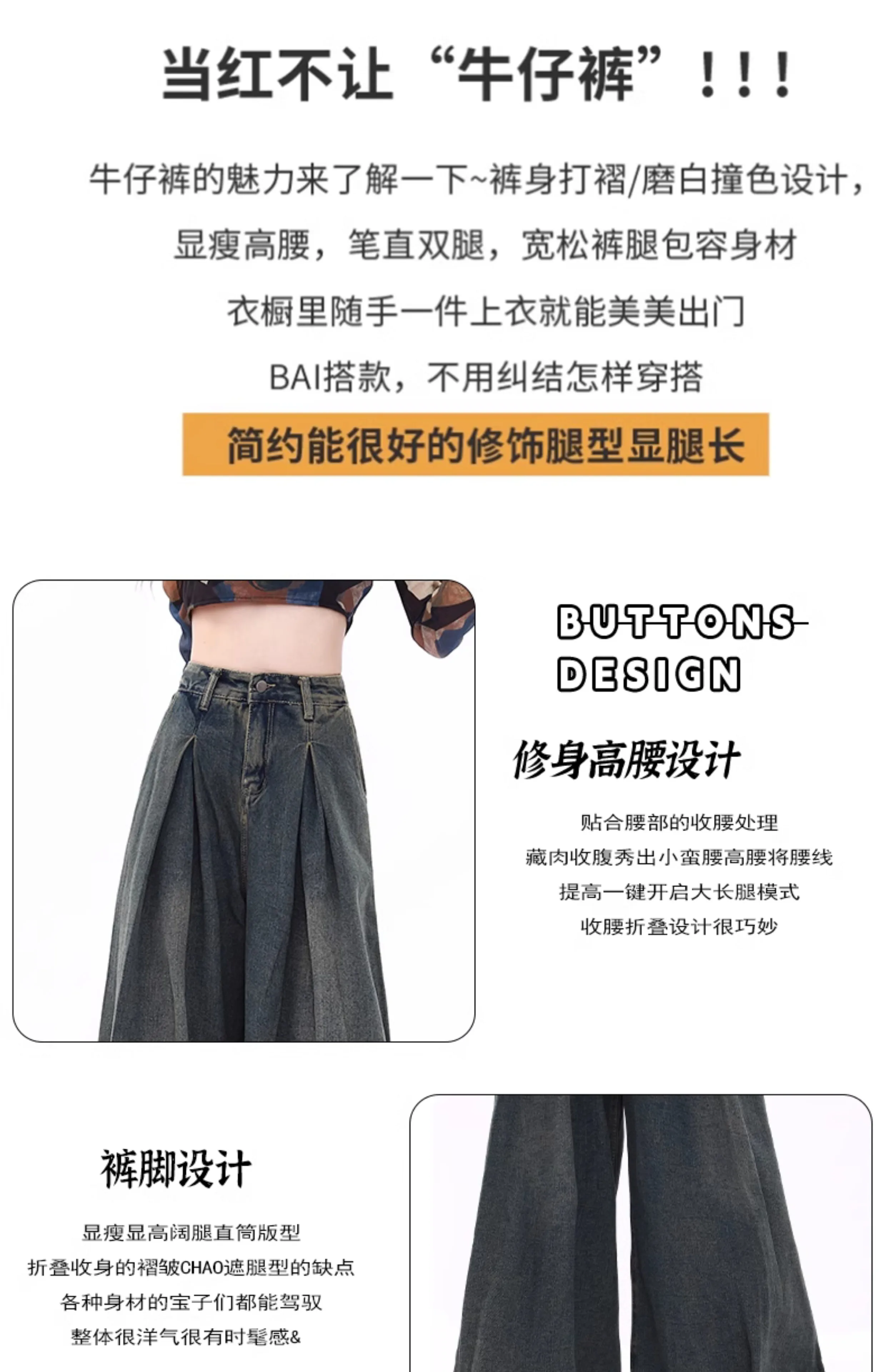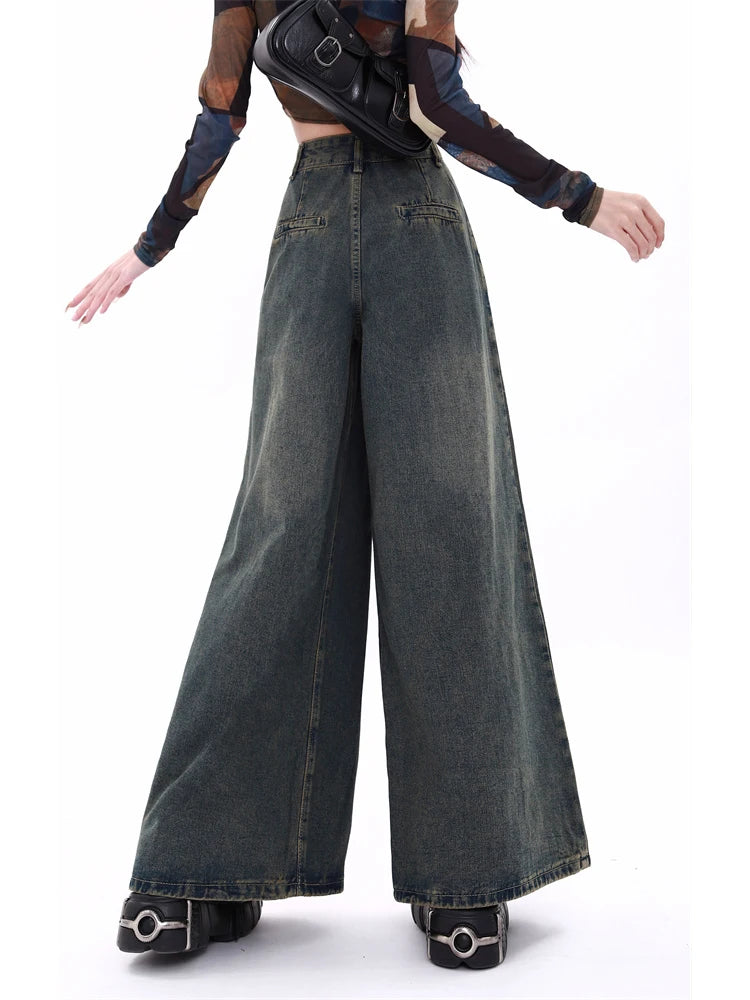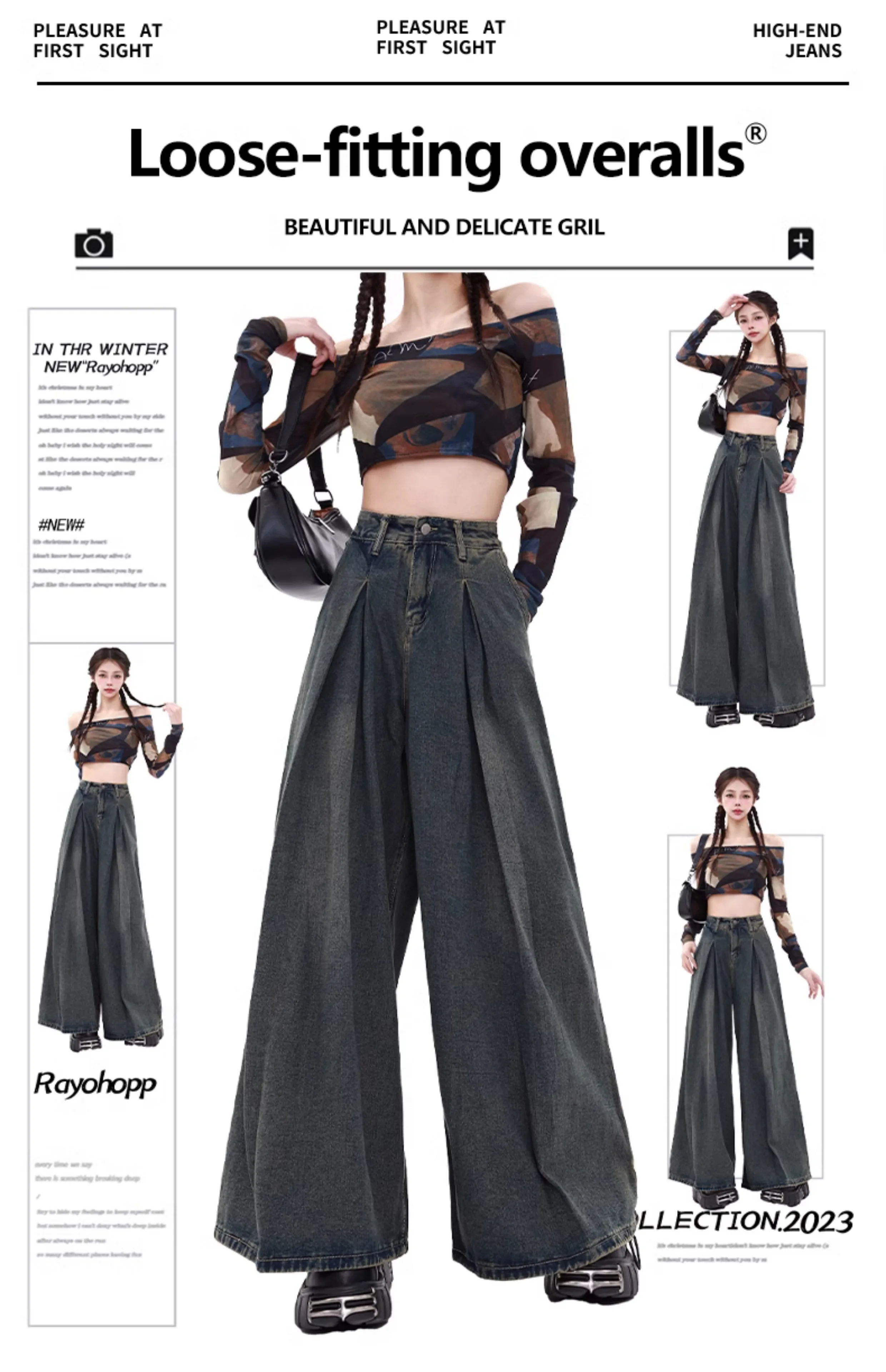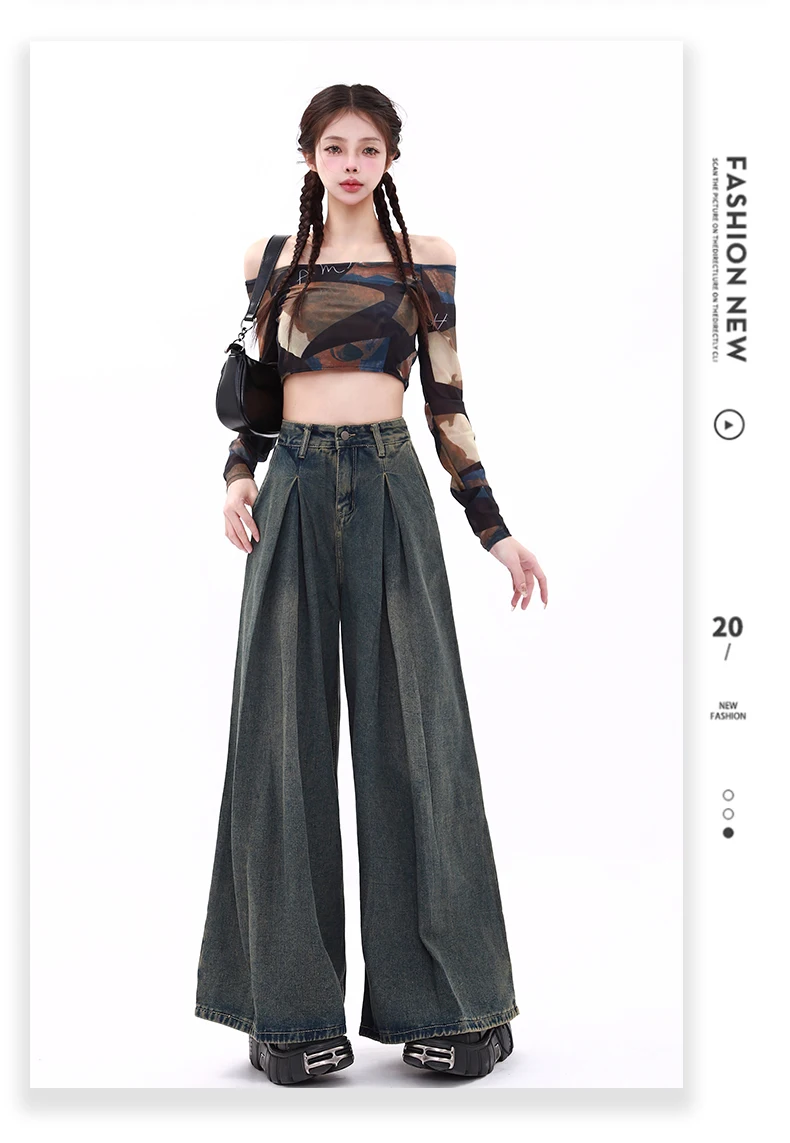 GETADME 여름 여성 한국 패션 플레어 플리츠 맘진 Y2K 일본 벨보텀 데님 팬츠 롱 팬츠 2000년대 K팝 고블린 코어