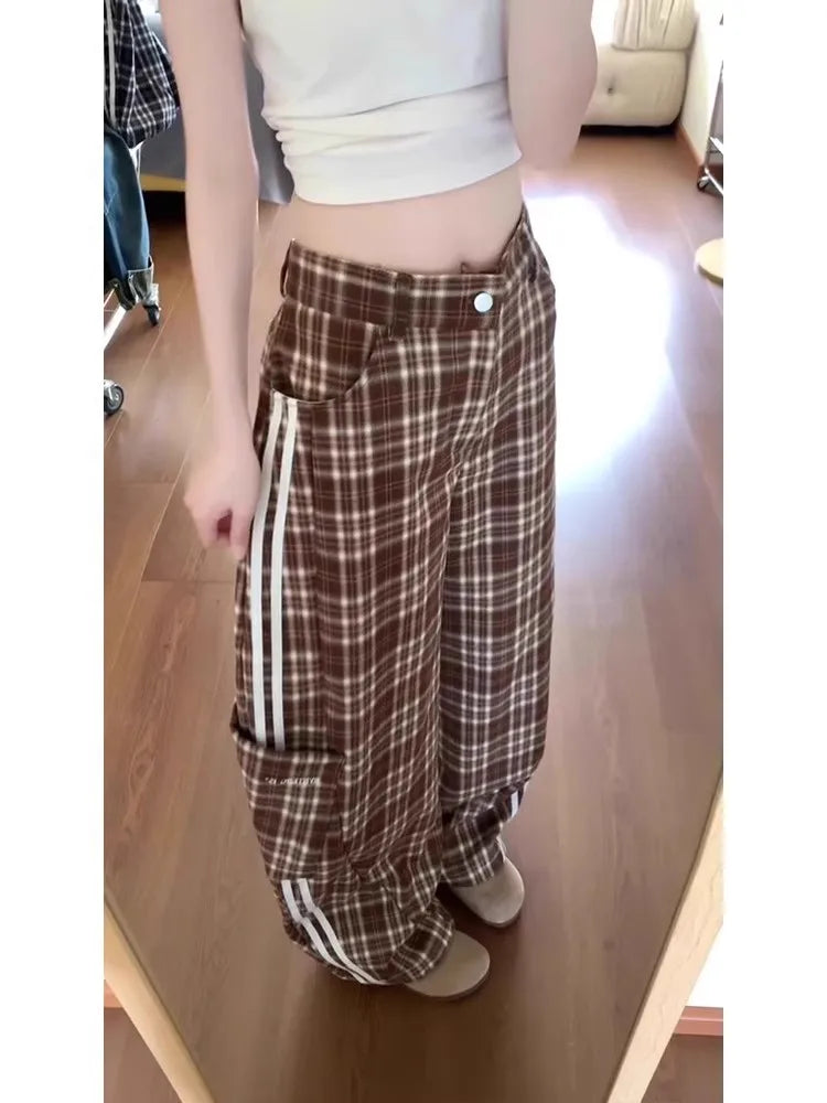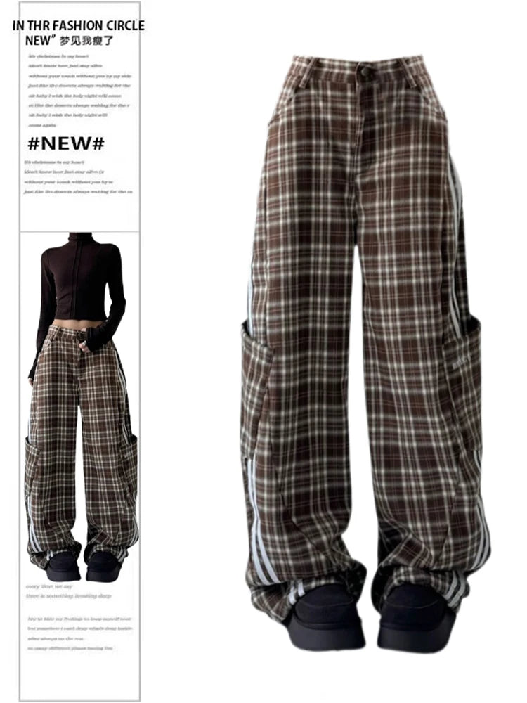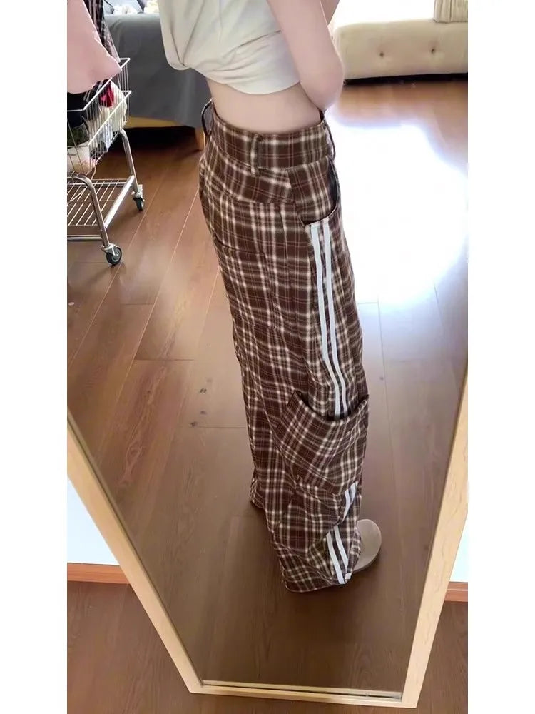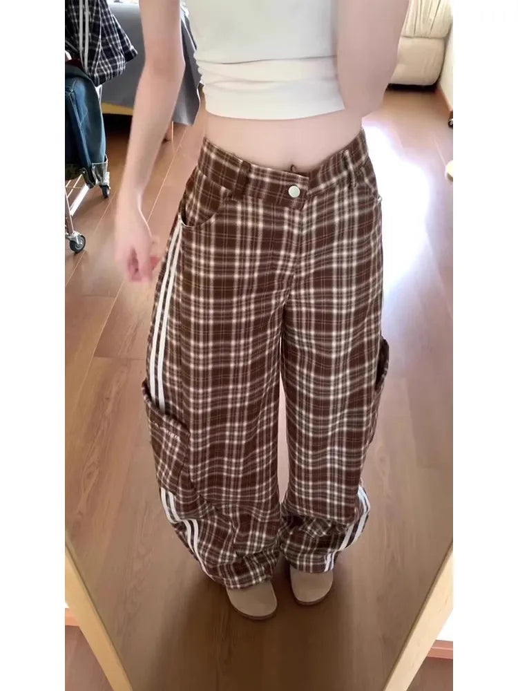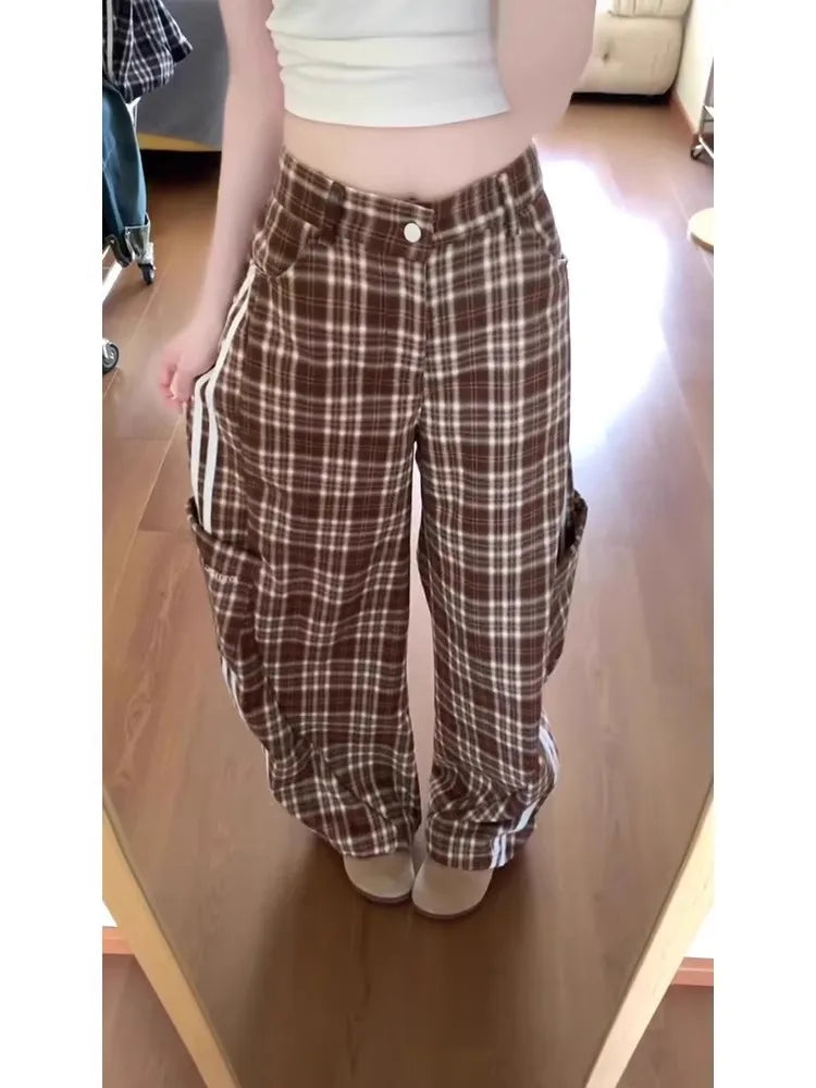 GETADME 여성 아메리칸 스트리트 배기 아비 롱 팬츠 갸루 플레드 팬츠 Y2K 일본 하라주쿠 로우 라이즈 K팝 사이버 펑크 와이드 레그 소녀