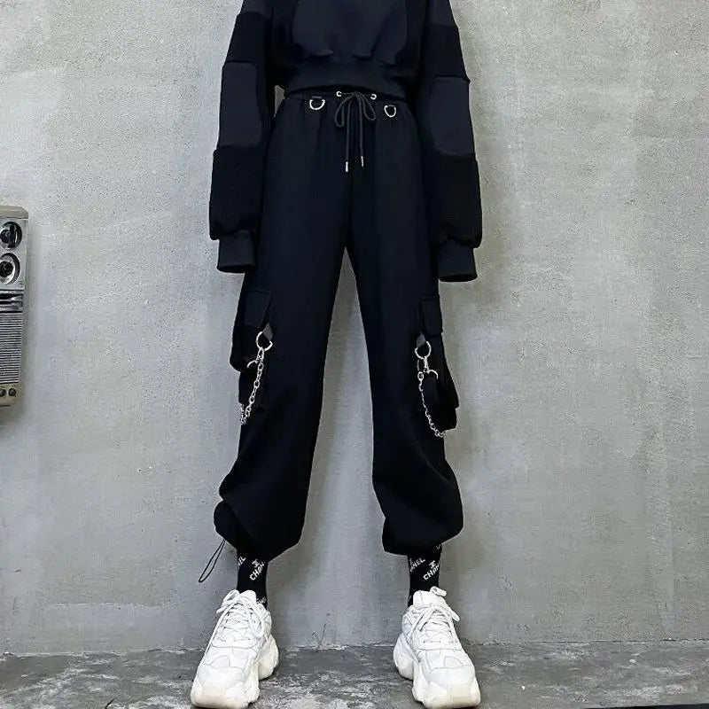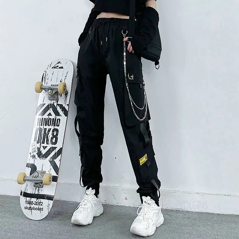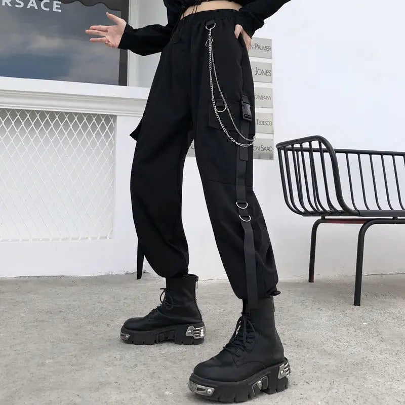 스트리트웨어 봄 여름 카고 팬츠 여성 하라주쿠 슬림 펑크 리본 조거 팬츠 신축성 허리 발목 길이 바지 (여아용)