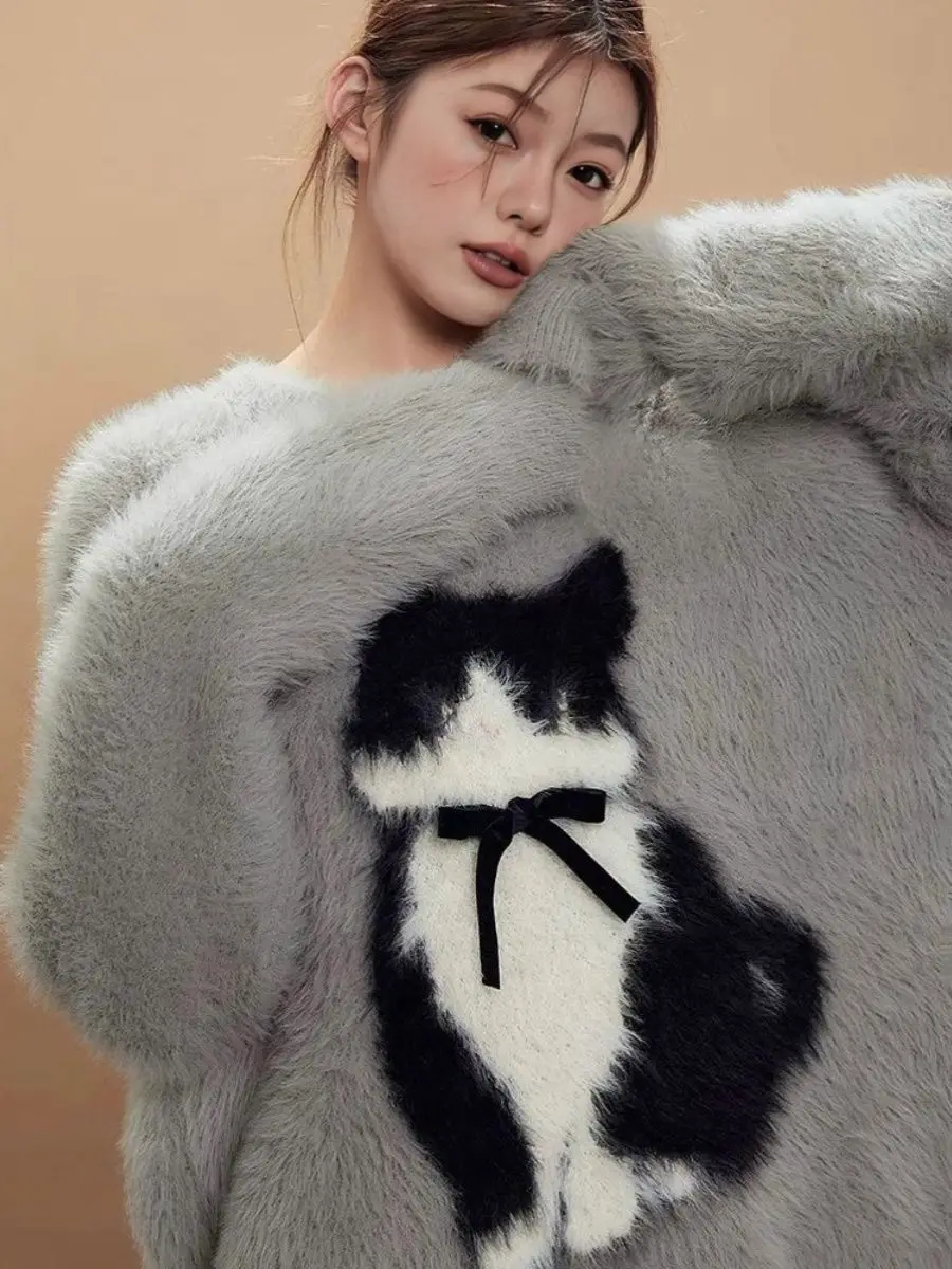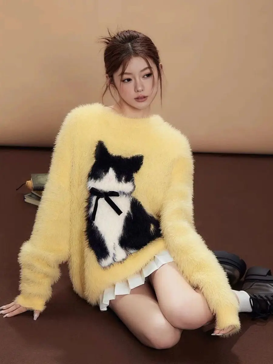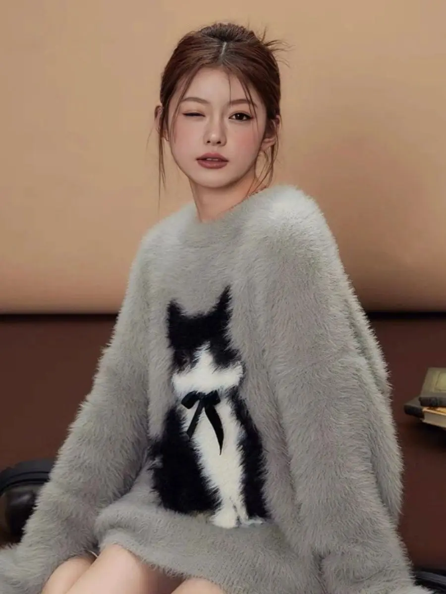 GETADME 미국 레트로 만화 고양이 리본 플러시 스웨터 스웨터 여성 Y2K 한국 가을과 겨울 달콤하고 매콤한 자카드 루즈 풀오버
