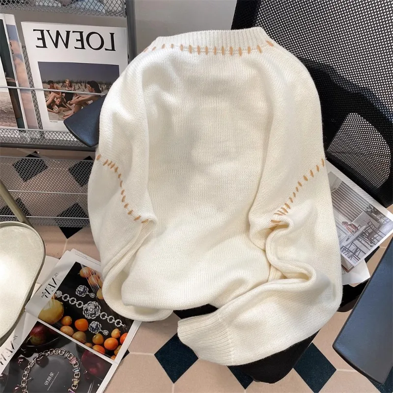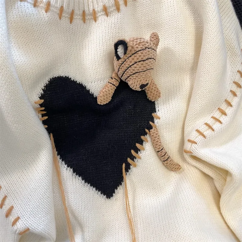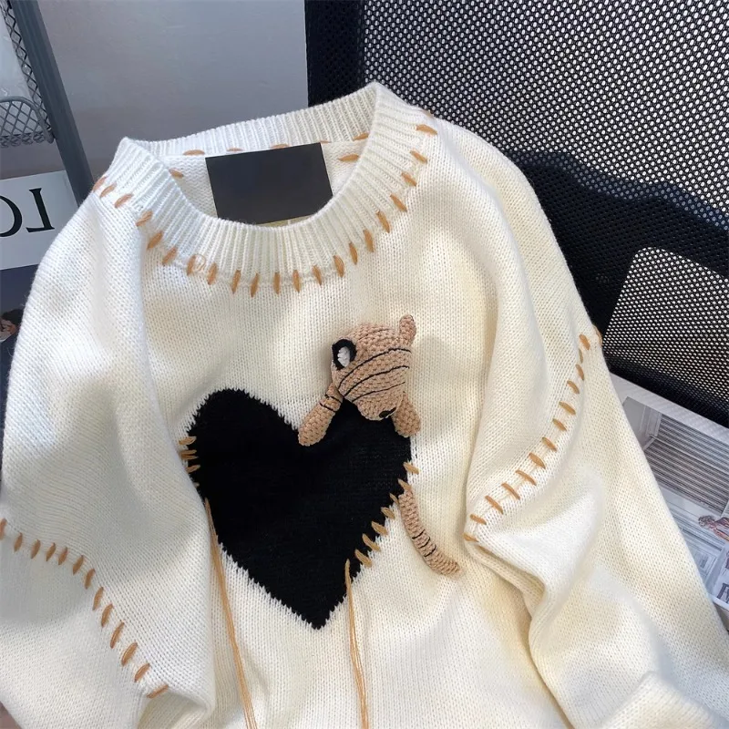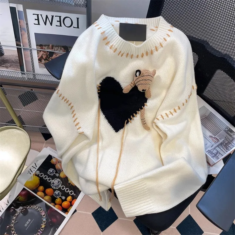 GETADME 히키가와 시크 패션 여성 3D 베어 하트 스웨터 가을 겨울 캐주얼 루즈 올매치 니트 풀오버 탑 여성