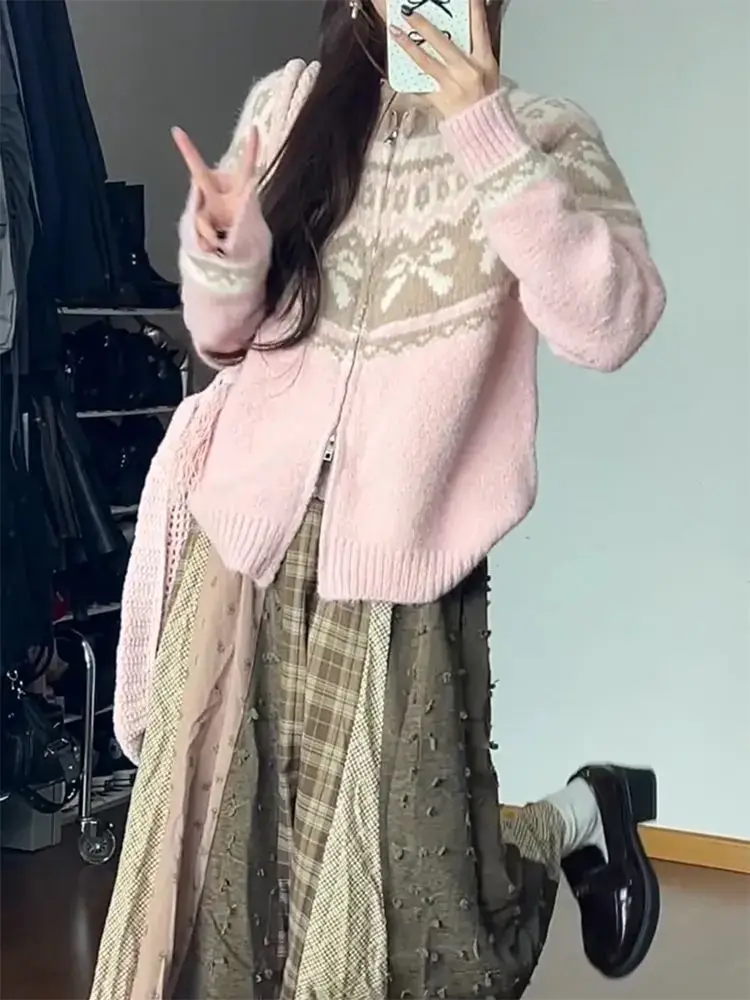GETADME 한국 패션 버전 달콤한 리본 자카드 스웨터 지퍼 카디건 여성 가을 겨울 느슨한 핑크 니트 카와이 스웨터 코트 탑
