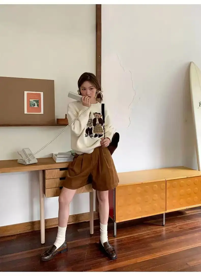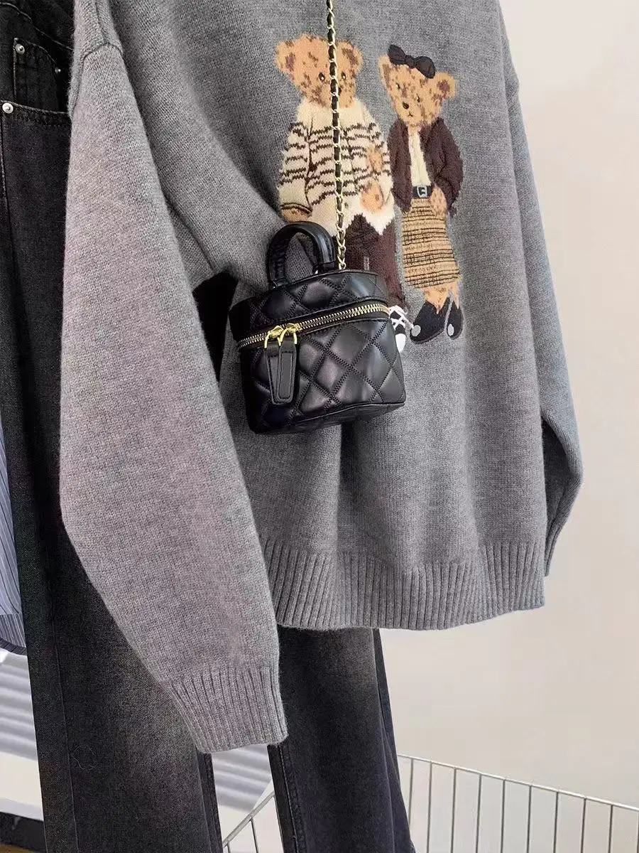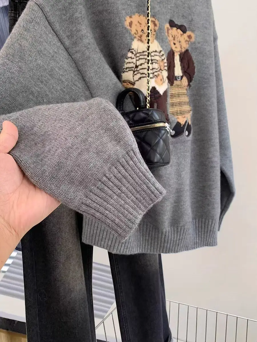 Getadme 여성 두꺼운 따뜻한 겨울 귀여운 스웨터 하라주쿠 폴로 베어 자카드 스웨터 O넥 긴팔 점퍼 풀오버 힙합 Y2K 탑